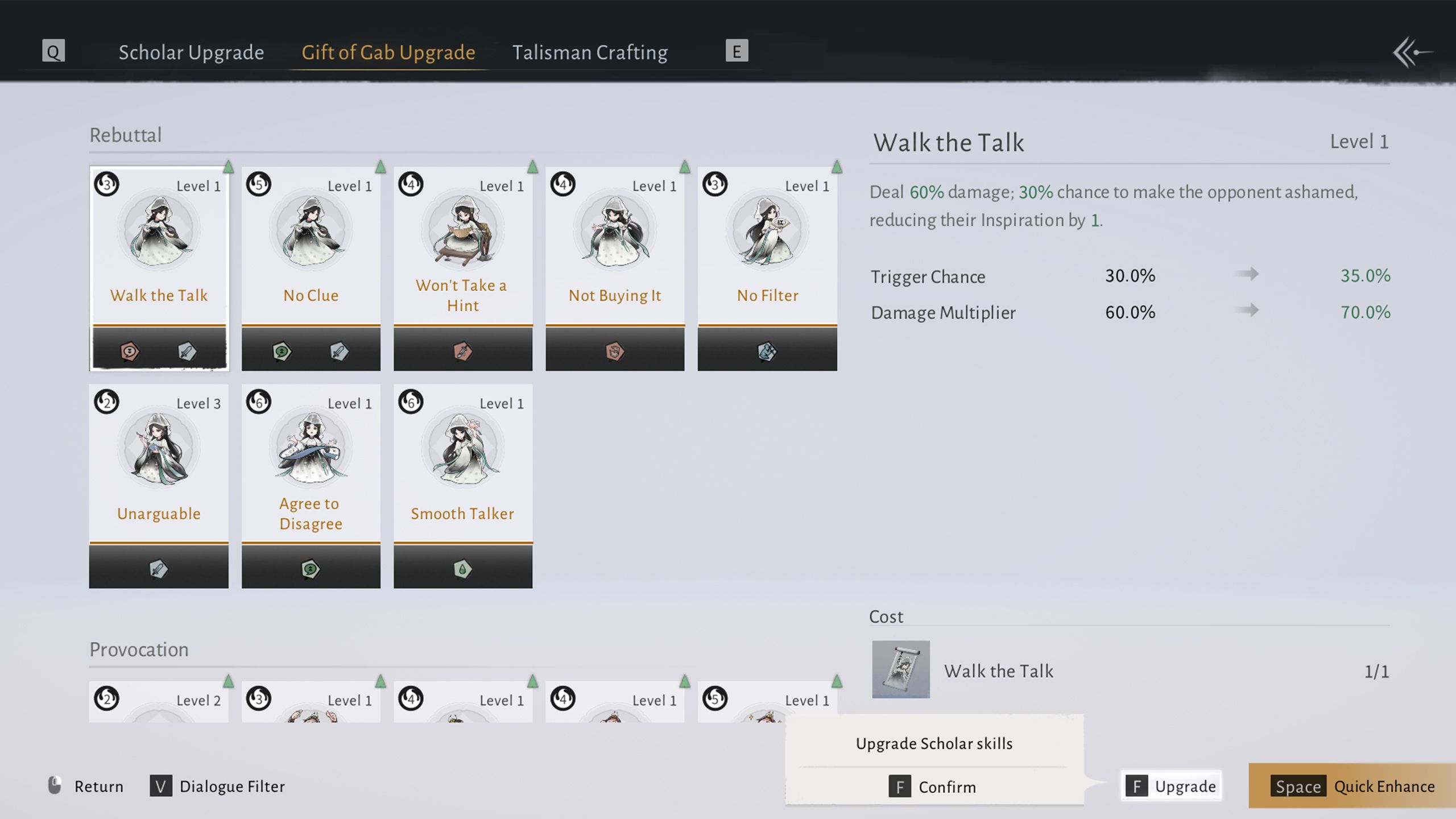 Okay, so if you want to really get good with Gift of Gab, you have to unlock the Scholar Profession. I finally did it after hitting level 13 in the game – there’s this quest called ‘Legacy: Scholar’s Path’ you need to finish in WWM. Once you’re a Scholar, you can upgrade two things: your character’s skills in the ‘Scholar Upgrade’ section, and then the actual effects of your Gift of Gab cards in the ‘Gift of Gab Upgrade’ section. It makes a huge difference!