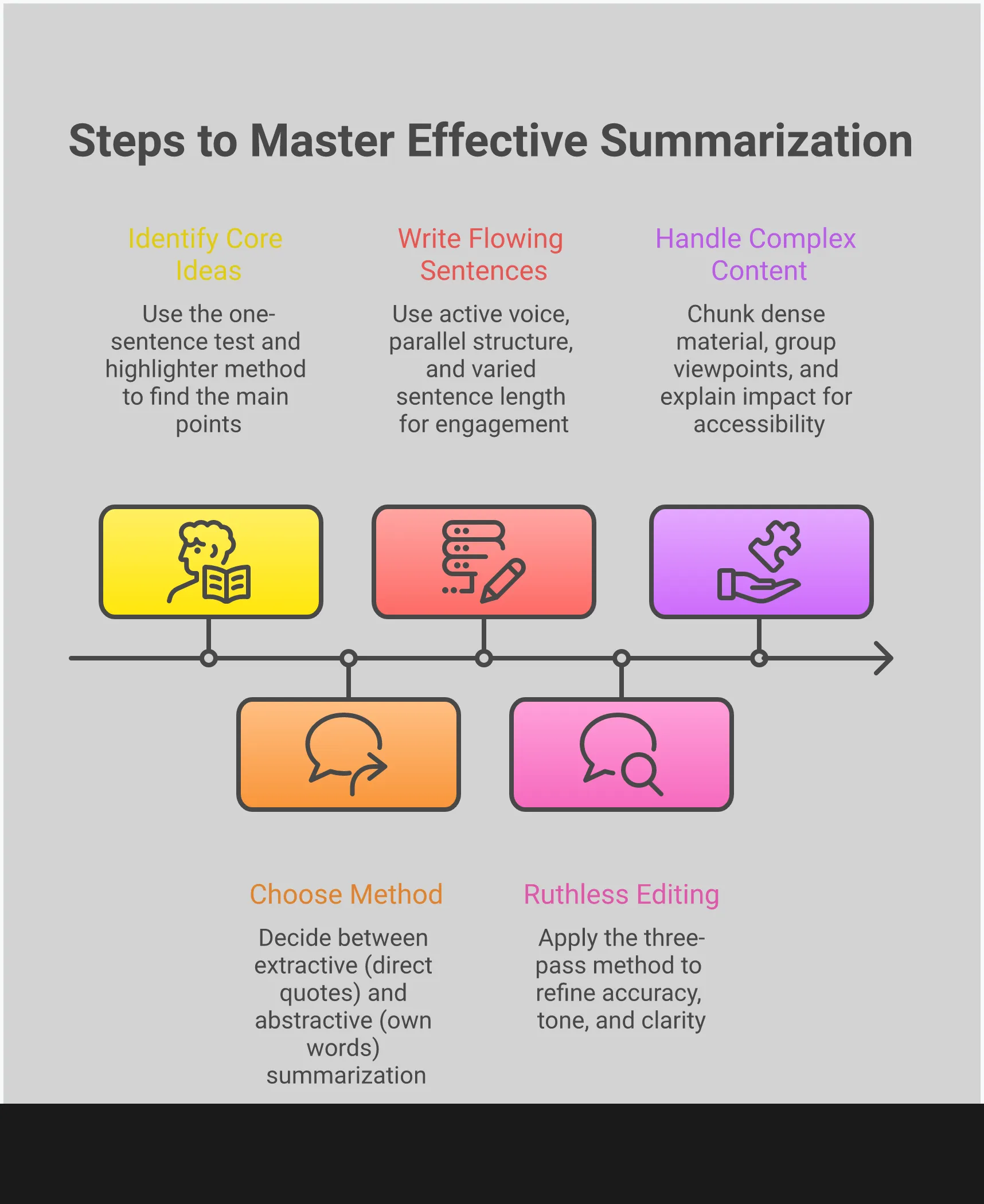 It’s common to face challenges when summarizing, but understanding those challenges makes them easier to overcome. Most difficulties boil down to three key areas: tackling complex information, deciding how much detail to include, and staying focused on the main points. Improving in these areas will help you create summaries that are concise, clear, and impactful.