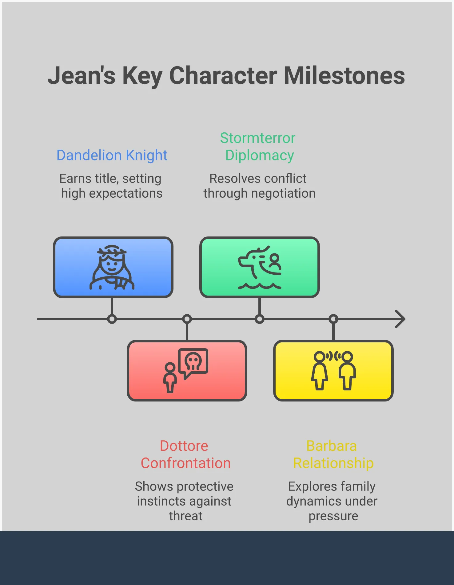 Jean is more than just a leader – she embodies Mondstadt’s rich history. She strongly believes in the traditions of the Knights of Favonius, demonstrated by her granting the Traveler the title of Honorary Knight as a thank you for their assistance. This highlights her commitment to preserving the Knights’ customs. Looking ahead, Jean might delve into forgotten parts of Mondstadt’s past, like the history of the nobility before the Knights existed or the stories of past leaders. By understanding the city’s history more fully, Jean hopes to gain the insight and power needed to lead Mondstadt forward.