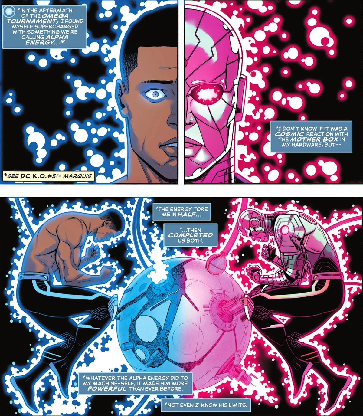 When Vic was exposed to a powerful creative force, he was fully healed, but it also separated the mechanical parts of him, creating a new being called Cyborg. Despite becoming a separate entity, this new Cyborg still seemed to care about his former teammates in the Justice League and Titans, and attempted to create a perfect, lasting environment for them all. The reason for this isn’t fully understood, but it probably relates to his belief that he can prevent an upcoming, major crisis.