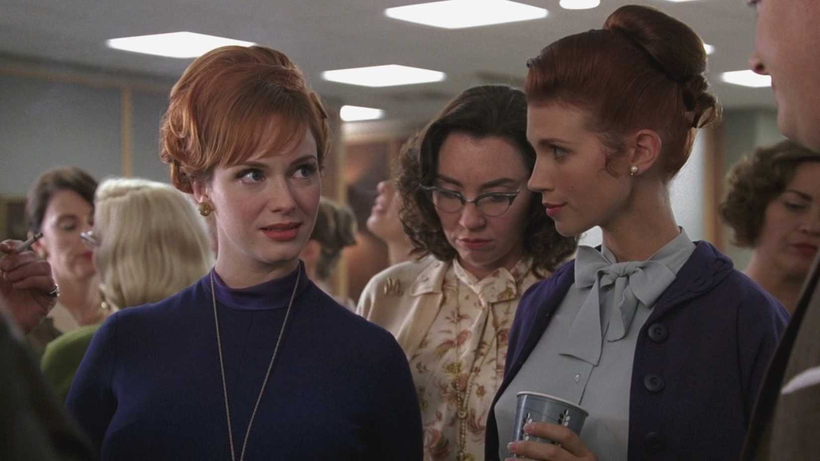 In November 1960, while the partners at Sterling Cooper watched the Nixon-Kennedy election results at home, the office staff had their own election party. When they started to run out of drinks, Joan stepped in and opened the office supply closet to keep the celebration going.