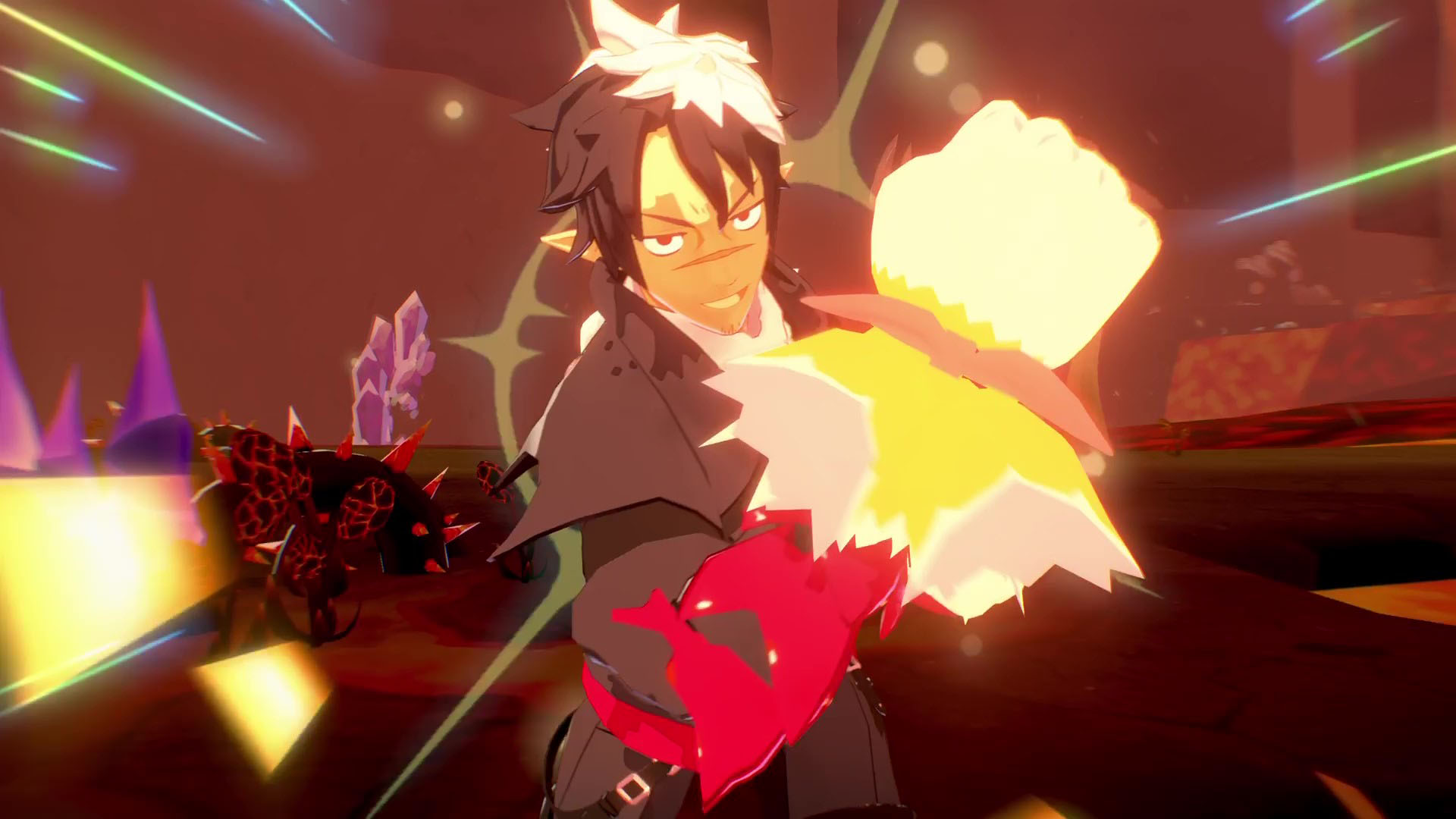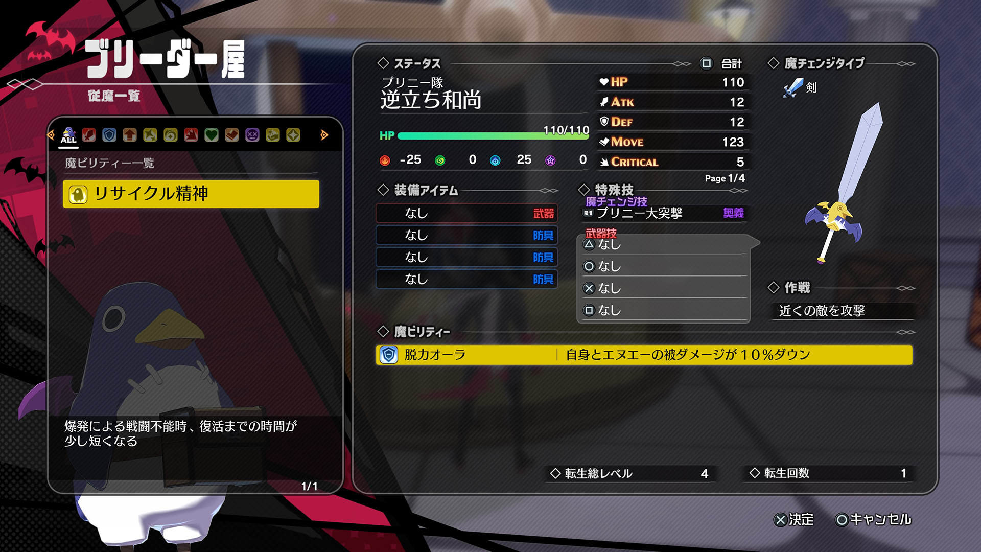 You’ll be able to recruit 16 different types of Servants—including Prinny, the mascot from Nippon Ichi—and bring up to 4 with you into battles. These Servants are fully customizable: you can change their name, color, how they fight, their stats, and even the special ability the hero, N.A., uses when they transform into a weapon. Later on, you can ‘reincarnate’ a Servant to reset their level, giving them permanent stat boosts. Reincarnation also lets you change their species while still keeping the unique skills they learned as their original type.