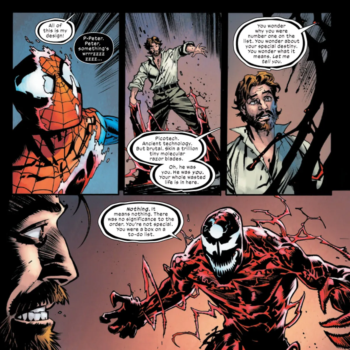 After the heroes protected Tony from the Maker, he retaliated by attempting to destroy them one by one. He began with Peter Parker, targeting him with his advanced symbiote suit. Then, transforming into Carnage, he brutally attacked Peter while cruelly reminding him that his sacrifices had been in vain.