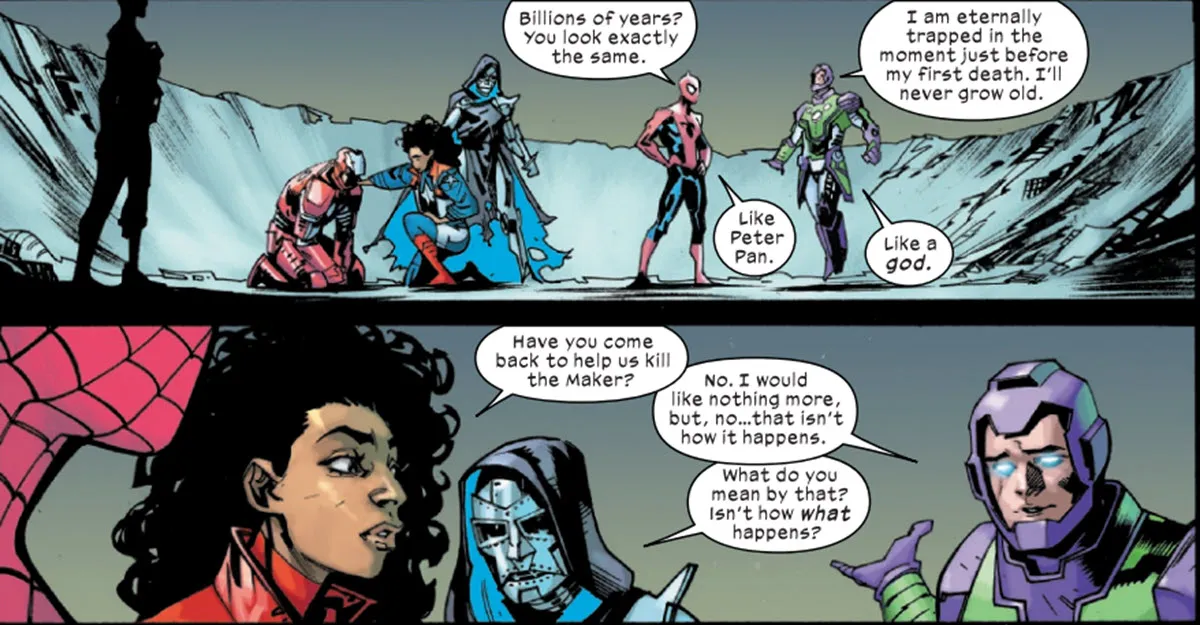 The heroes were hopelessly outmatched. The Maker had the power to change reality itself within his own realm. They did get a surprising ally in Kang, who said he was a future version of Tony Stark. But when Kang wouldn’t fight the Maker, Doom destroyed Kang’s time machine, effectively erasing him from existence.