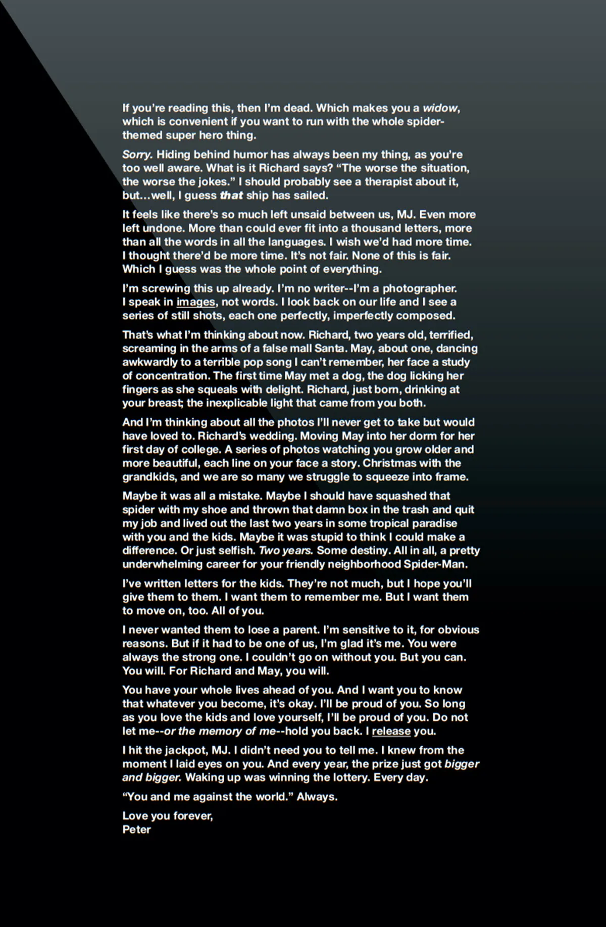 Mary Jane Watson seemed to feel Peter’s death happening, waking up and crying for no apparent reason in the middle of the night. The comic ended with a letter Peter had written in case he died as Spider-Man. It was a touching farewell to this version of Spider-Man and a fitting end to the Ultimate Spider-Man series.