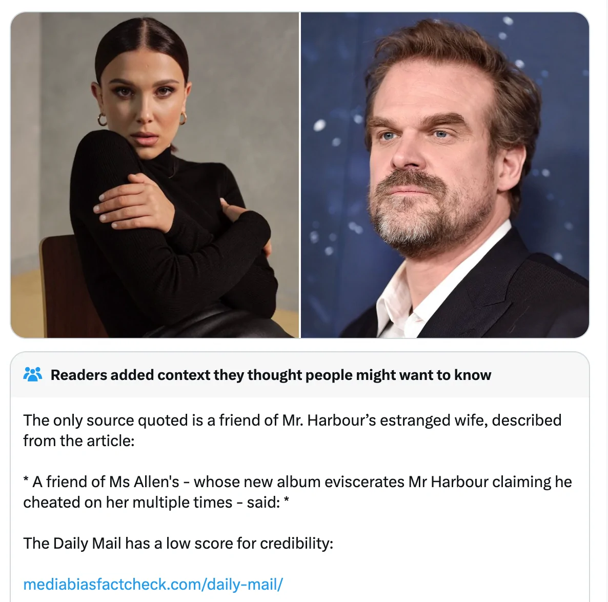 A post on X claimed something negative, but it was quickly fact-checked by Community Notes. The note pointed out that the only source was a friend of David Harbour’s soon-to-be ex-wife, who has publicly accused him of infidelity in her new album.