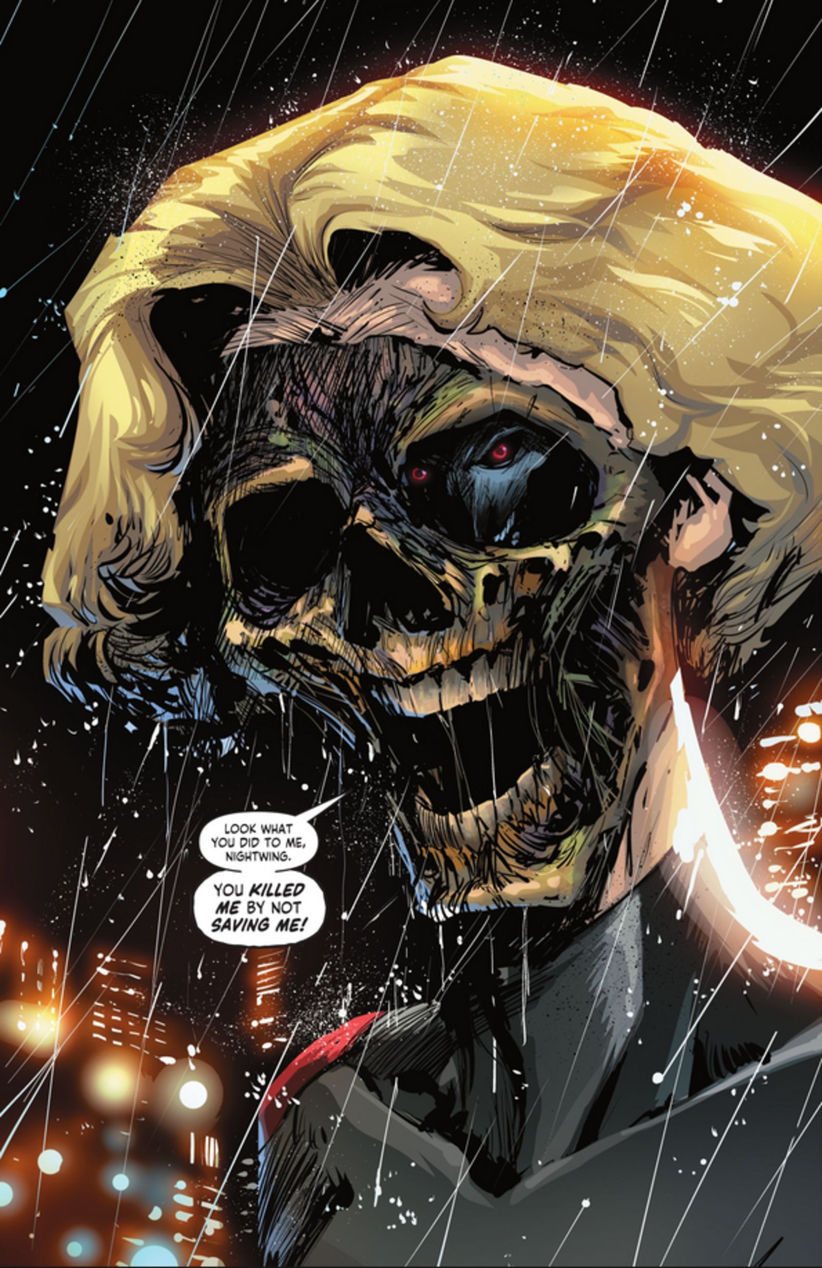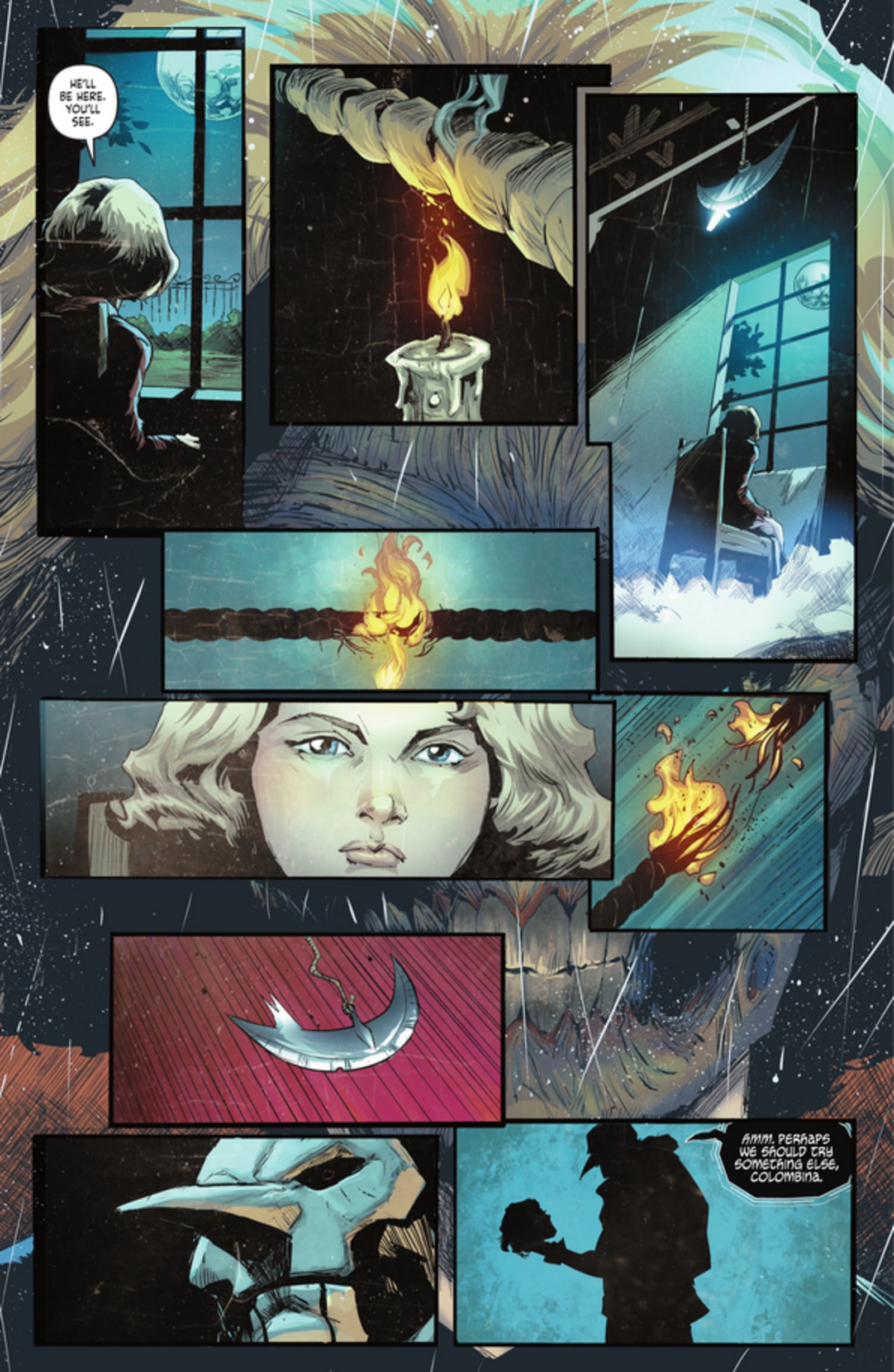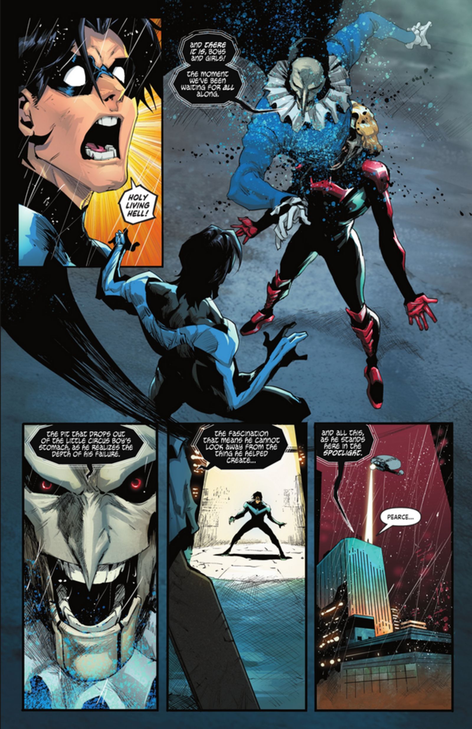 Following a months-long, covert battle against Spheric Solutions and the Cirque du Sin, the latest issue of Nightwing (#132, by Dan Watters, Dexter Soy, Veronica Gandini, and Wes Abbott) brings Dick Grayson face-to-face with his newest enemy. Surprisingly, the real threat isn’t Olivia Pearce, but the terrifying clown called Zanni, who has been manipulating her body and possesses powers beyond anything Nightwing could imagine.