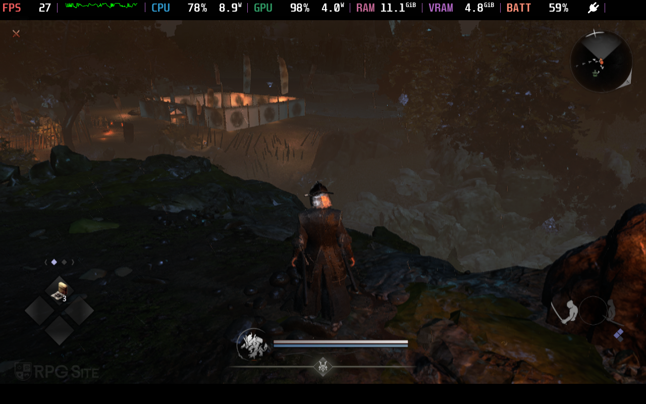 Playing Nioh 3 on my ROG Ally Z1 Extreme is noticeably smoother than on the Steam Deck right away. Initially, I was getting between 40 and 50 frames per second, but I prioritized a consistent experience and limited the frame rate to 30fps. I used the 25W Turbo Mode and allocated 6GB of memory to the graphics card, matching the game’s minimum requirements. For the best performance, I recommend setting a fixed 30fps frame rate, playing at 1080p resolution with FSR 3.1 enabled, and using dynamic resolution with a range of 25% to 100%. I also turned all advanced settings and post-effects down to their lowest options. After about eight hours of testing, this setup provides a consistently stable frame rate, although the lighting quality is reduced. I didn’t bother testing the 15W power mode because even with the 25W mode and these low settings, achieving a stable 30fps with acceptable visuals was already a challenge.