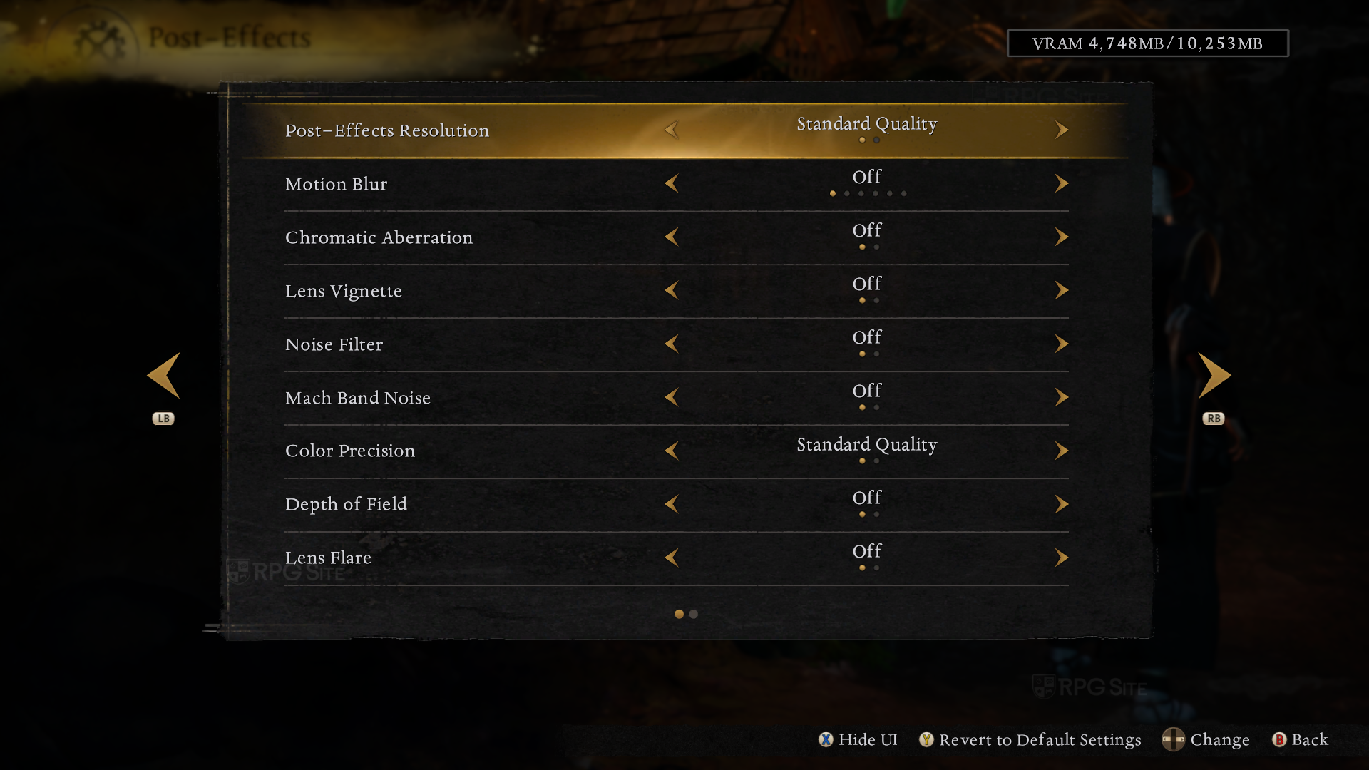 The Post-Effects menu allows you to change visual enhancements like blur, color distortion, and lighting effects such as bloom and shadows. The Advanced Settings menu lets you fine-tune the overall visual fidelity by adjusting details like shadow quality, texture resolution, the number of objects displayed, and the quality of effects like clouds and reflections. You can also control performance by adjusting settings like the frame rate and quality of cut-scenes.