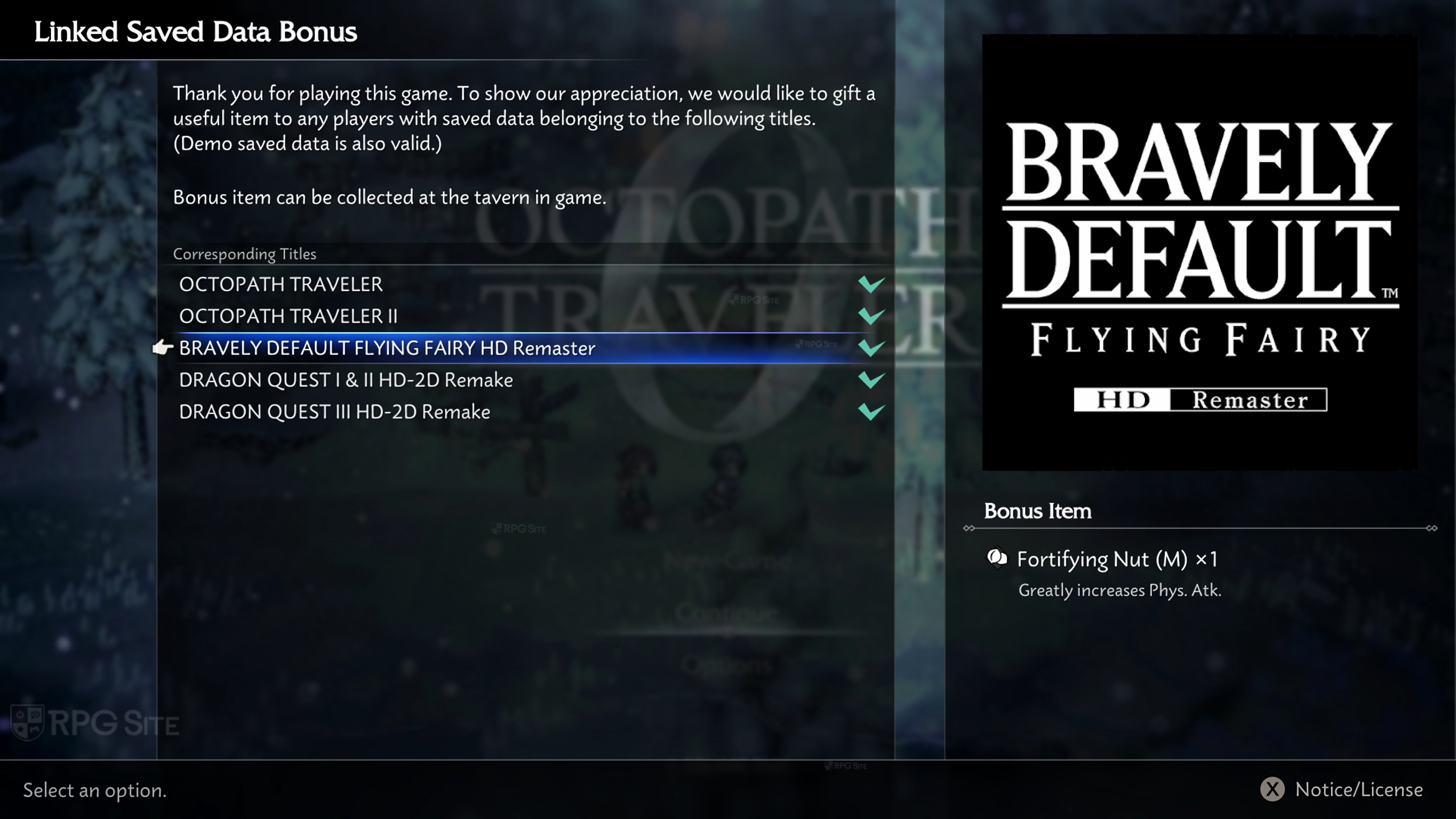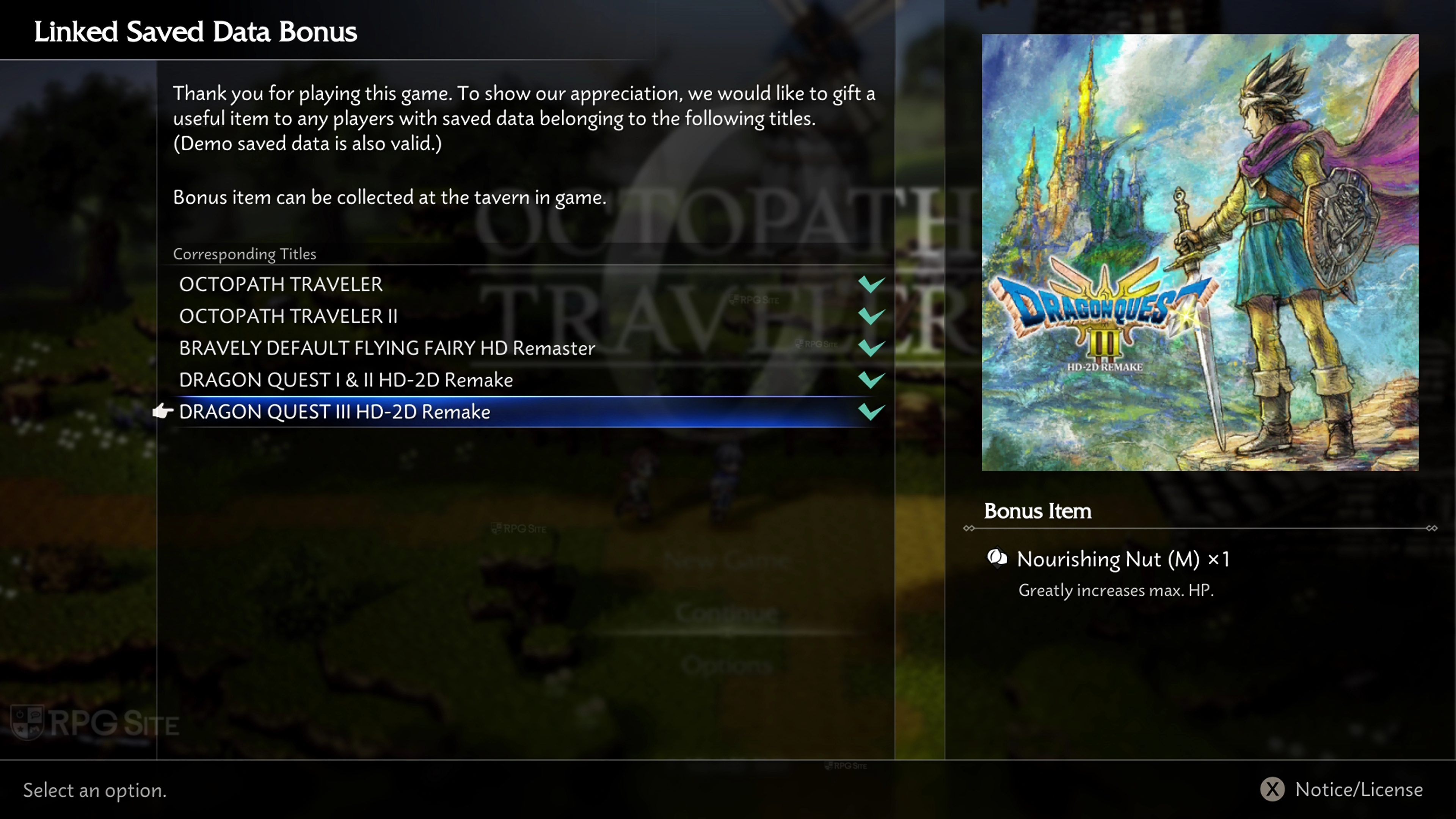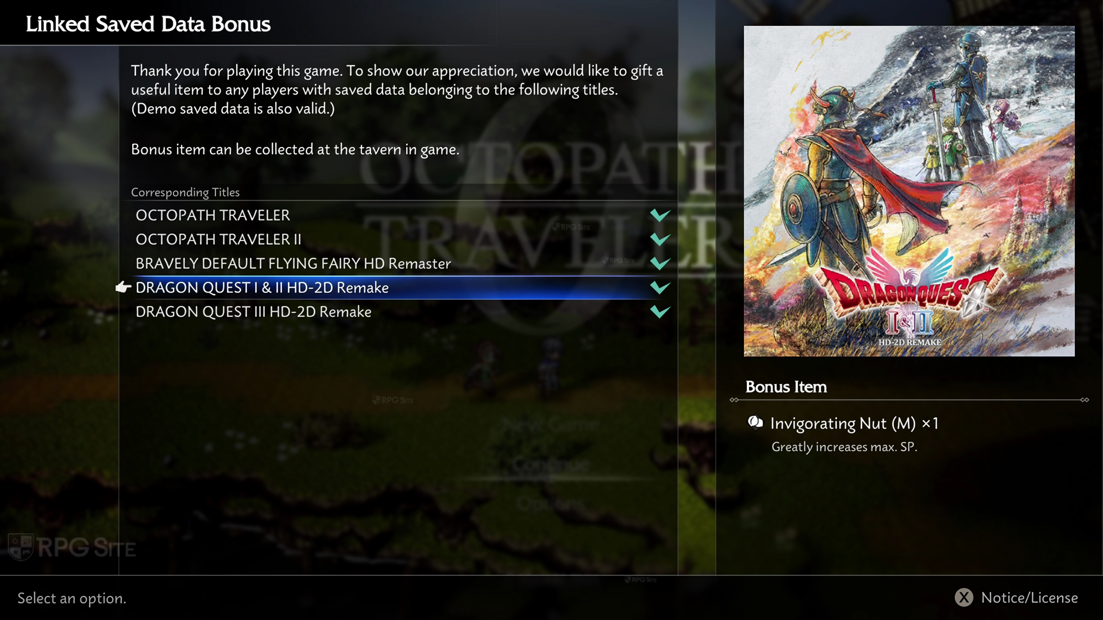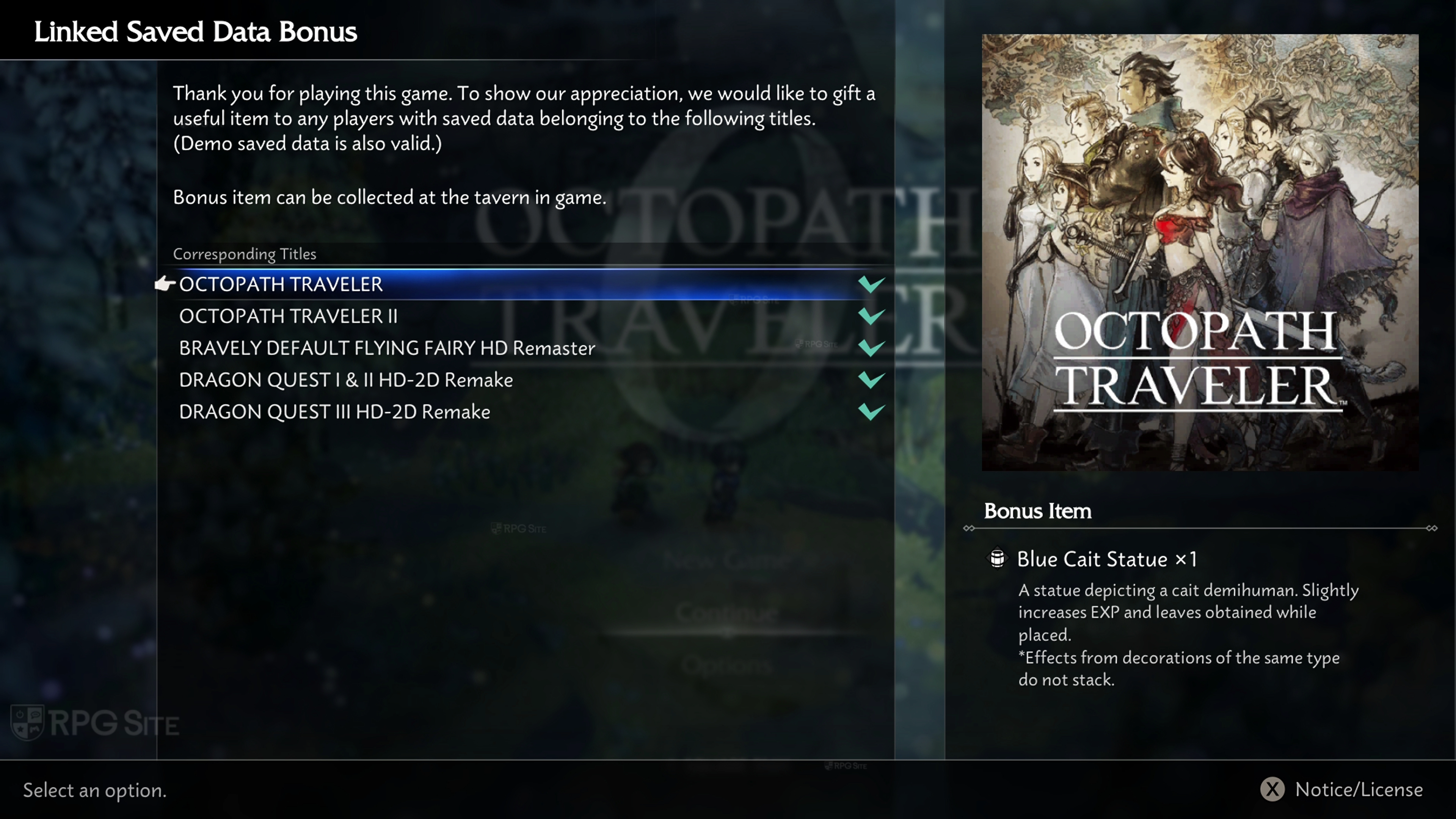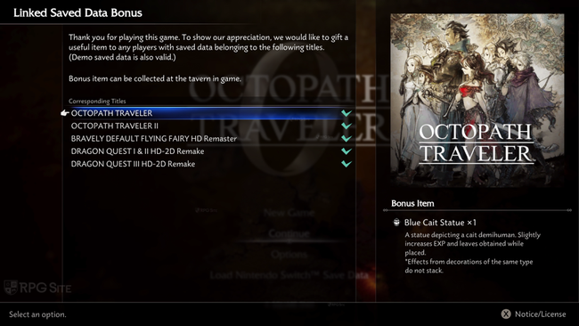 Where to check save data bonus in Octopath Traveler 0