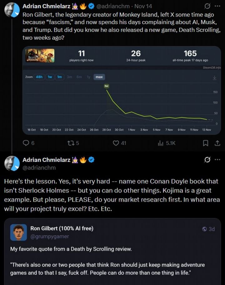 The game Death by Scrolling didn’t attract many players when it first launched, a fact that developer Adrian Chmielarz (known for games like Painkiller, Bulletstorm, and The Vanishing of Etan Carter) highlighted in a recent post on X (formerly Twitter).