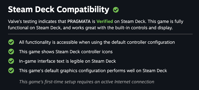 Valve reports that Pragmata runs decently on the Steam Deck with its standard settings. However, for the best possible experience, I suggest using FSR 3 and turning on gyro controls through Steam Input. Also, be aware that the game requires an internet connection for initial setup, and many players – including me – have been having trouble with its DRM. See my full rating below: