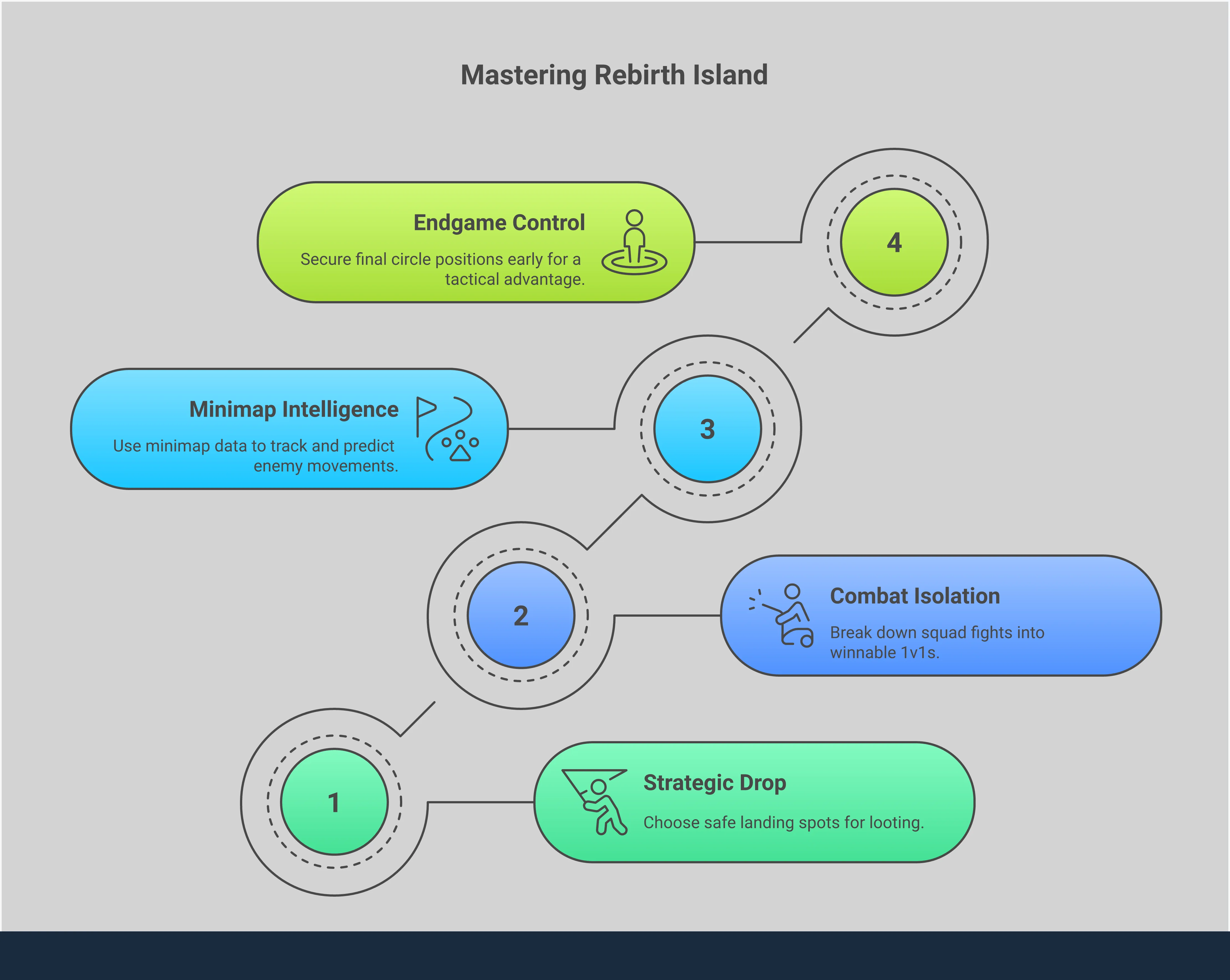 Succeeding in Solo Quads isn’t only about being a great shooter; it’s about being smarter than your opponents and having a strong base of skills. Before you try to fight a whole team, you need to be really good at the basics. Consider these skills as your building blocks-the better you are at them, the more confidently and boldly you can play. Getting these fundamentals right will give you the courage to challenge teams and make clever decisions that can win you the game. Let’s look at the three most important parts of surviving on Rebirth Island: movement, understanding the map, and knowing when to fight.