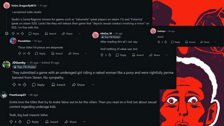 The GamesRadar article sparked a lot of discussion on Reddit, and many users immediately agreed with the ban. The most popular comment criticized the studio, questioning its reputation and noting its low player numbers on Steam, ending with a simple “I’m fine with this.” Someone replied, claiming the article was a biased attempt to damage Valve and Steam’s image. Many other commenters simply expressed their approval with short responses like “good,” “no sympathy,” or “nothing was lost.”