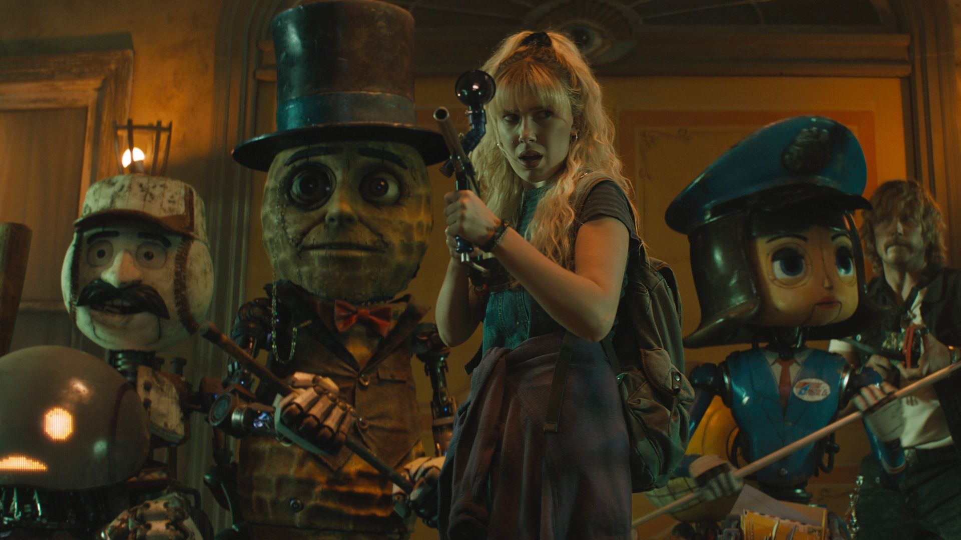 The group’s search leads them to an abandoned shopping mall within the dangerous Exclusion Zone, where they find Mr. Peanut and a group of friendly robots in hiding. They also encounter Amherst, who explains a lot of the backstory: Christopher is in a coma and being held by Ethan Skate – yes, that’s his name! – who used Christopher’s incredible intelligence to invent the Neurocaster. This technology powers both military drones and a virtual reality world that many people escape into, letting their drone counterparts work for them. It’s a setup very similar to Ready Player One, and The Electric State even shares some of its visual style. The movie reaches a dramatic peak when a drone controlled by Giancarlo Esposito – who always seems to play the good guy! – violently tears Mr. Peanut’s hat off, yelling, “You broke the peace treaty, Mr. Peanut!”
