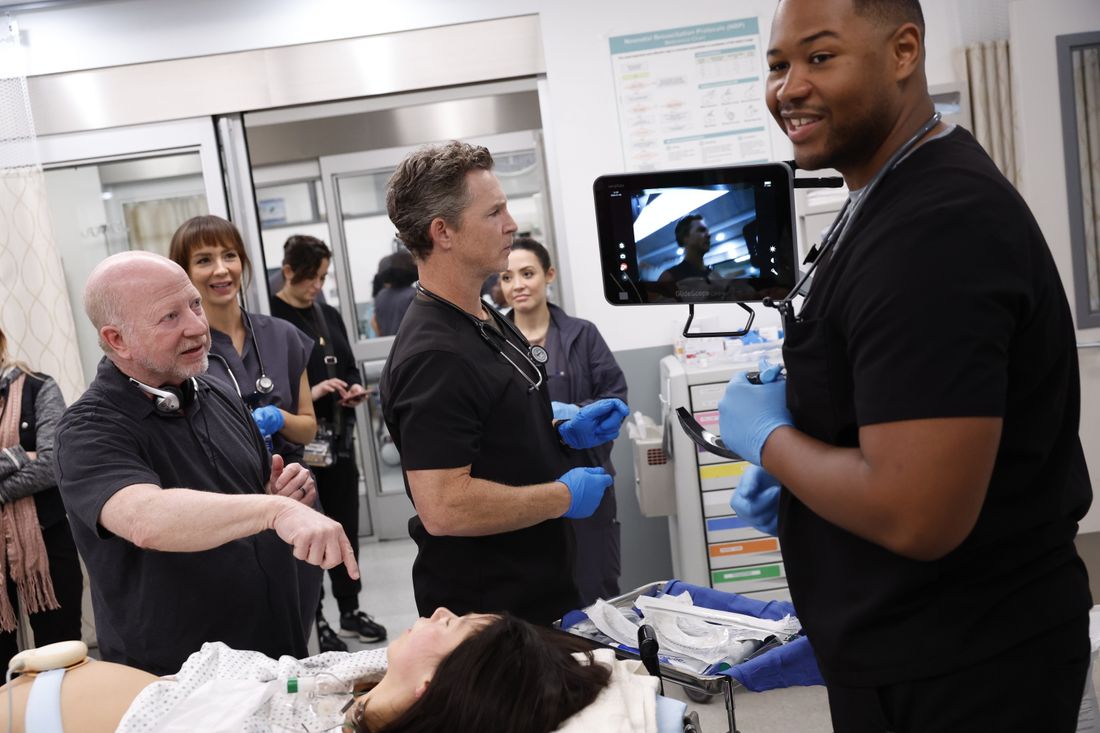 The day after filming the difficult trauma scene, I observed a scene where several characters said goodbye to Robby, each hoping to help him before he makes a bad decision. Actor Rob Wyle is incredibly skilled at portraying subtle emotions – he often tilts his head slightly and smiles even when his character is clearly suffering. In this scene, Duke, who was visiting the ER for a sore throat, unexpectedly receives serious news and uses the moment to urge Robby to take care of himself. After carefully rehearsing the movements of all the actors, the director decided to film close-ups of Wyle’s face. Wyle had already delivered a moving performance, but he took it to another level. His face, already showing sadness, seemed to deepen with new lines and creases, making his eyes even more mournful and his smile heartbreakingly painful.