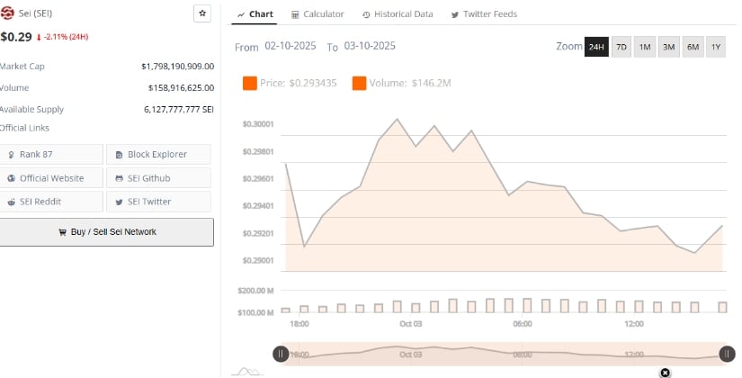 Latest scoop: Sei rings in at $0.29, down a whopping 2.11% in 24 hours – ooof! Market cap’s a cool $1.79 billion (top 90 cryptos, rejoice!), but trading volume’s $158.9 million, which is like moderate applause in a comedy club: polite, but not roaring with laughter. Moderate activity? Pfft, not the breakout party we were promised. 🚀❌