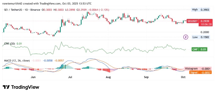 On the daily chart, SEI/USDT’s consolidating at $0.2930, ever-so-slightly dipping like a shy dancer. Chaikin Money Flow’s at 0.00 – neutral as a Swiss cheese that’s not hole-y enough. Inflows and outflows balancing like fickle lovers, matching the sideways shuffle. Buyers, wake up! We need that CMF climbing positive for some real accumulation action, or it’s snooze city. 🤩📊