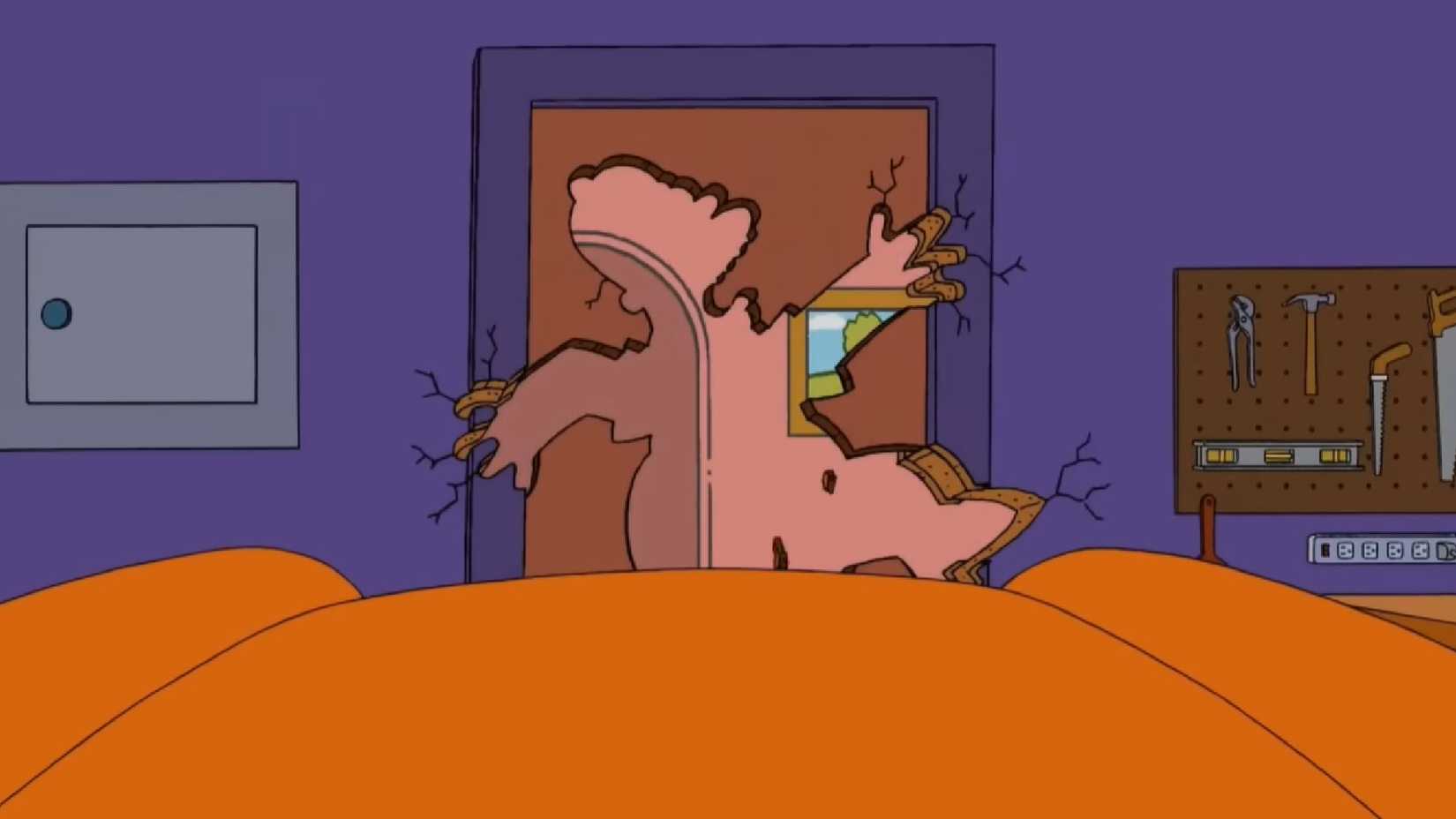 This joke refers to a change in the show’s opening credits that happened in season 20. Previously, Homer would run through the door while yelling. The updated opening shows what happens after he crashes through it, turning a silly, physical gag into something more dramatic and unexpected.
