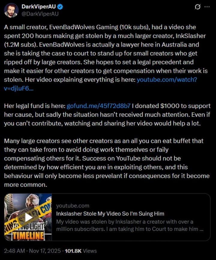 I stumbled across this YouTuber, EvenBadWolves, and she’s awesome! She’s an Aussie gamer who basically makes super detailed videos about games she really enjoys – like, she’ll break down the whole story of a game or even a whole series. She did a massive retrospective on the Dying Light franchise recently, it was incredible. But things just got crazy. She posted a video saying another YouTuber, Inkslasher, straight-up copied one of her videos, and now she’s actually suing him! She’s hoping this will help other small creators like herself and set a rule that protects our work.