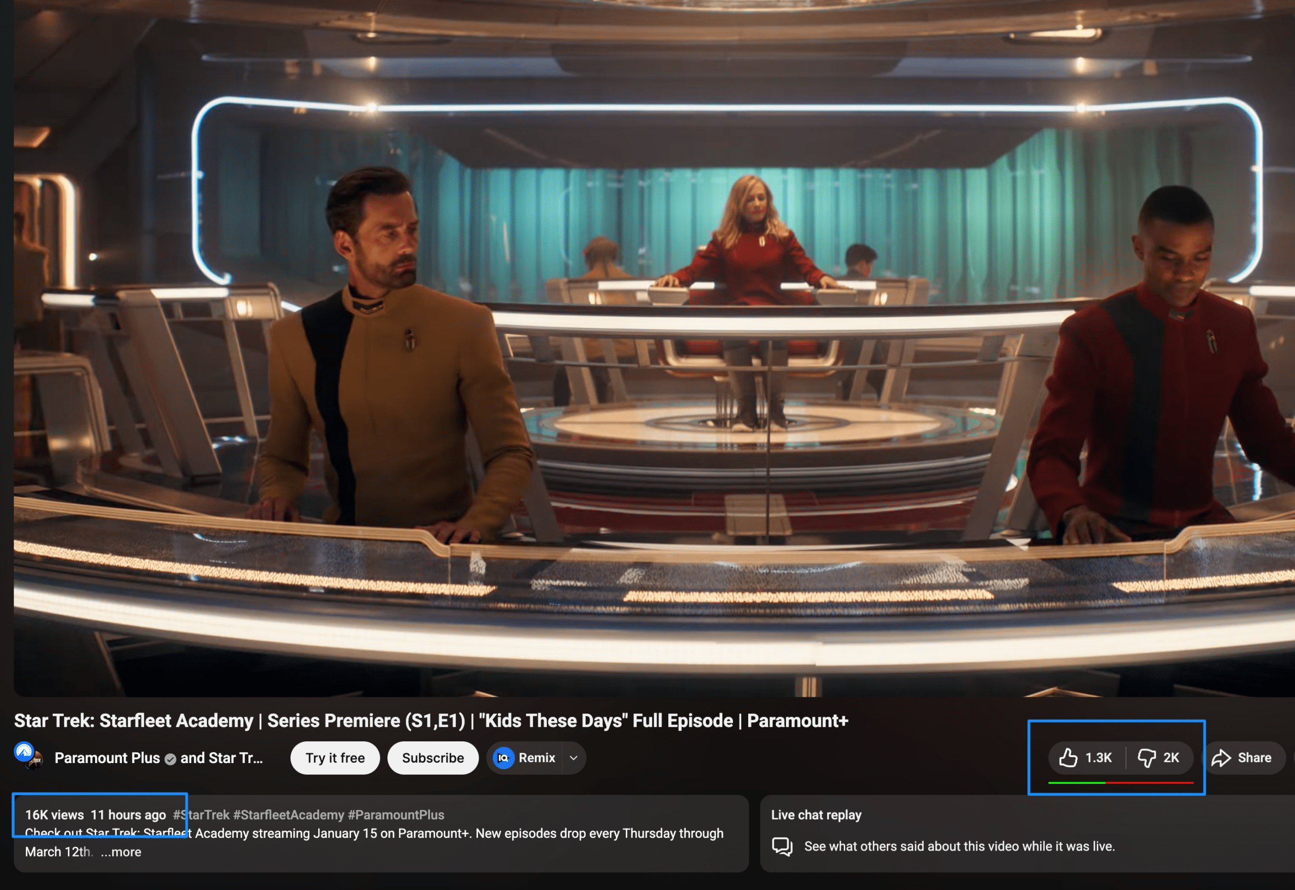 The first episode of Star Trek: Starfleet Academy launched on YouTube with a live premiere event that reached around 1,300 viewers at its peak.