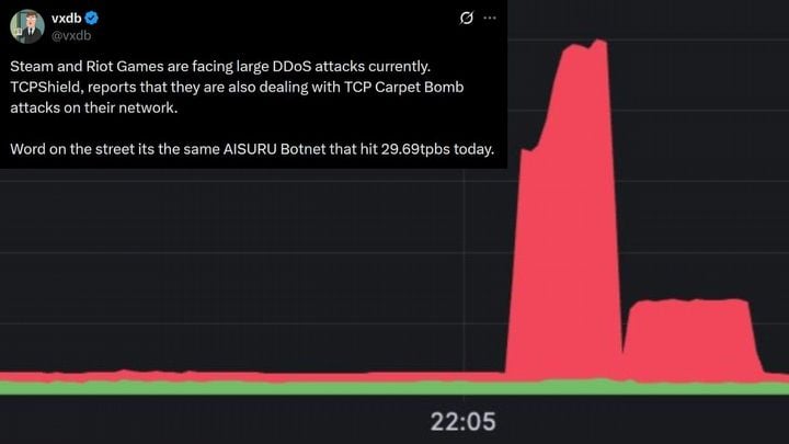 The recent outages are believed to be the result of a large botnet called Aisuru, which experienced unusually high traffic levels during the disruptions. Information from Downdetector and a social media post by @cripto_lion suggest a widespread impact. Steam was among the targets, but many other gaming services and games were also affected. PlayStation Network and EA experienced outages simultaneously with Steam, and players reported issues with games like Marvel Rivals, Call of Duty, Palworld, Counter-Strike, Valorant, Dead by Daylight, Dota 2, and League of Legends.