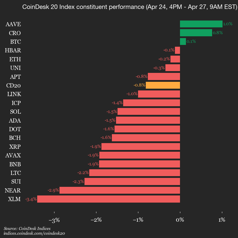 Leaders: AAVE (+1.0%) and CRO (+0.8%) – because someone had to be the heroes today. Laggards: XLM (-3.4%) and NEAR (-2.9%) – because even the stars have off days. Or, in XLM’s case, a full-blown midlife crisis.