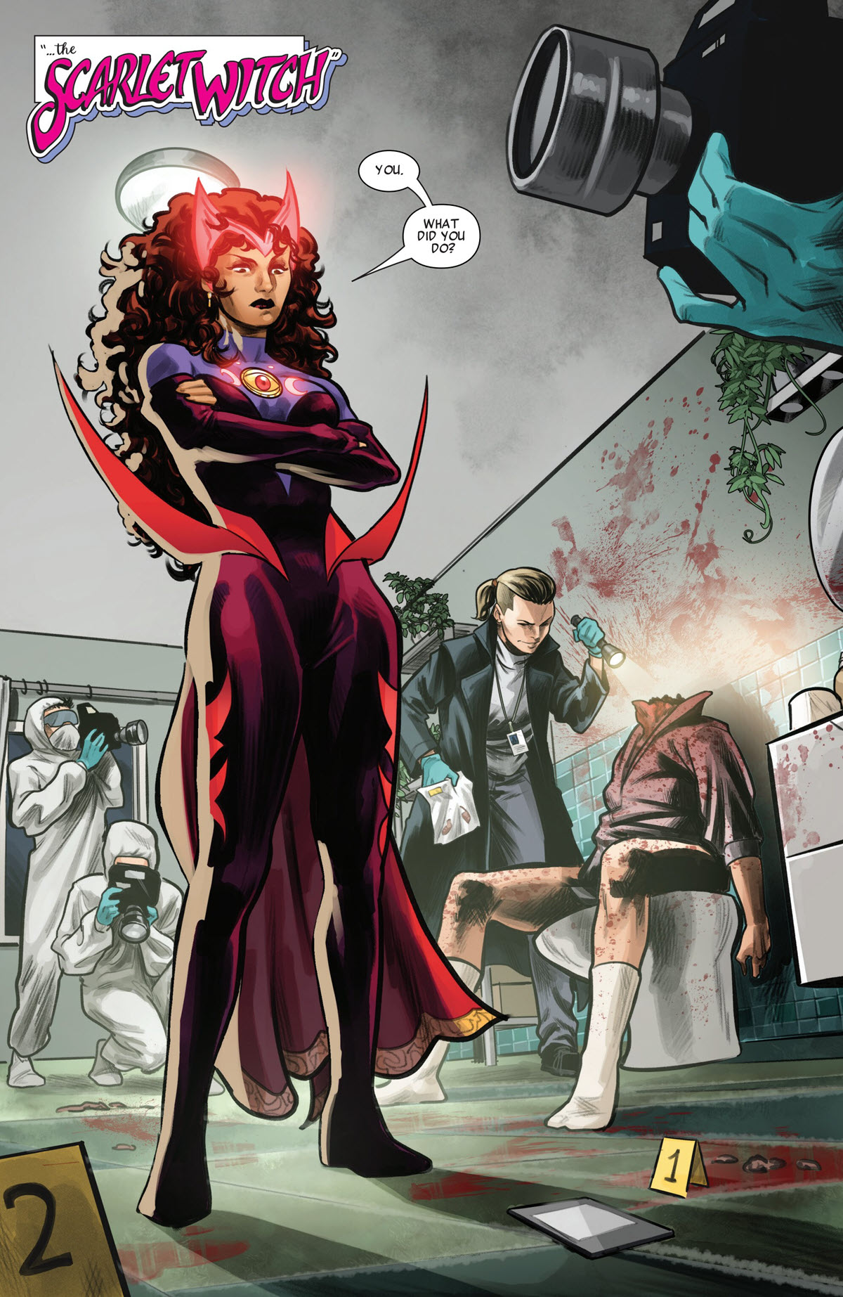Meanwhile, a couple in Little Rock, Arkansas, unexpectedly die in a gruesome way – their heads explode. It’s unclear how this connects to Storm, but it leads to a brief appearance by Scarlet Witch. She investigates the scene and, at the end of the story, appears outside Storm’s window, questioning her about the cause of this disaster: “Storm – what have you done to bring this upon us all?”