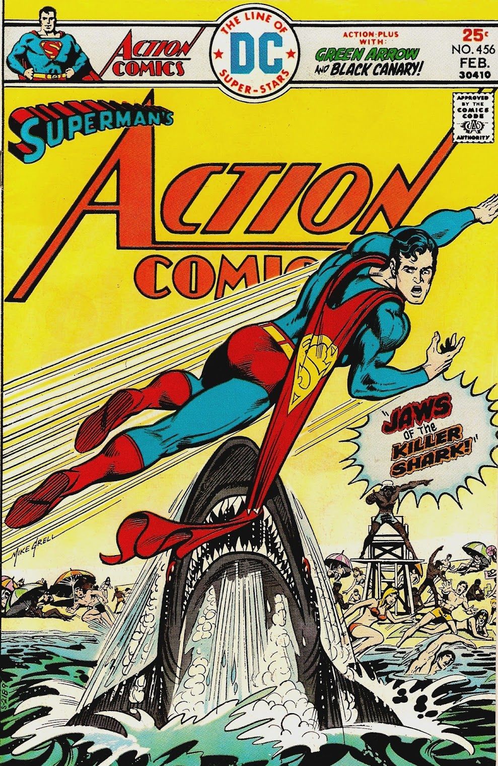 Okay, so you won’t believe this, but it’s those weird, of-the-moment references that led me to Action Comics #456 from November 1975. Seriously, Cary Bates, Curt Swan, and Tex Blaisdell actually had Superman fight… Jaws?! I couldn’t believe it when I first saw it!