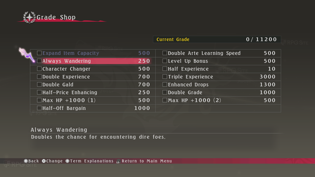 Tales of Berseria Remastered has the following Grade Shop settings available in the beginning: