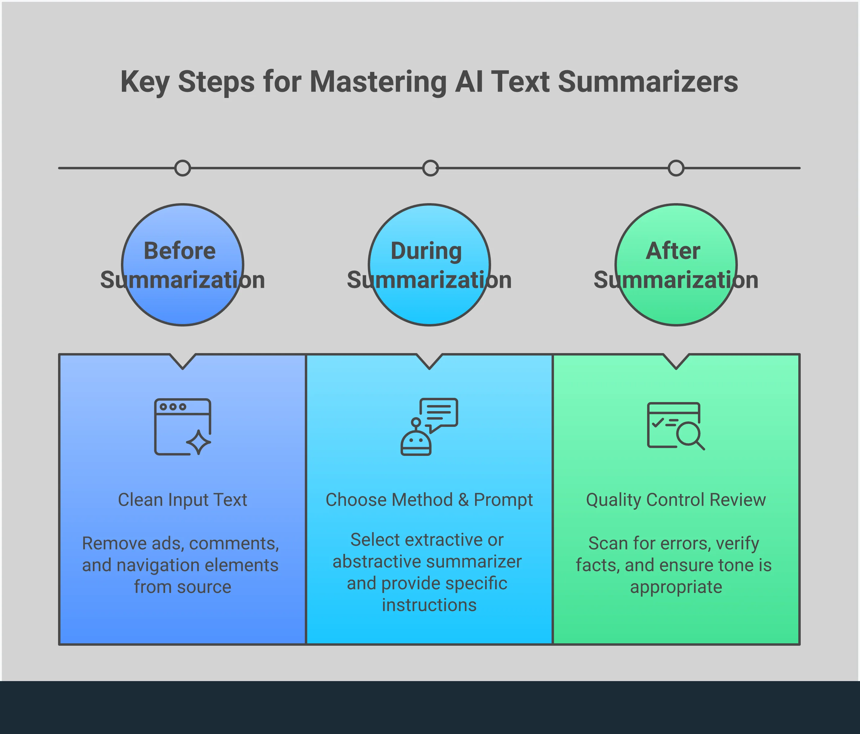 - Guide the AI for Better Results: A summarizer is a tool, not a mind reader. To get the most accurate output, feed it clean text without ads or clutter, give it clear instructions on what to focus on, and always give the final summary a quick review to ensure no important context was lost.