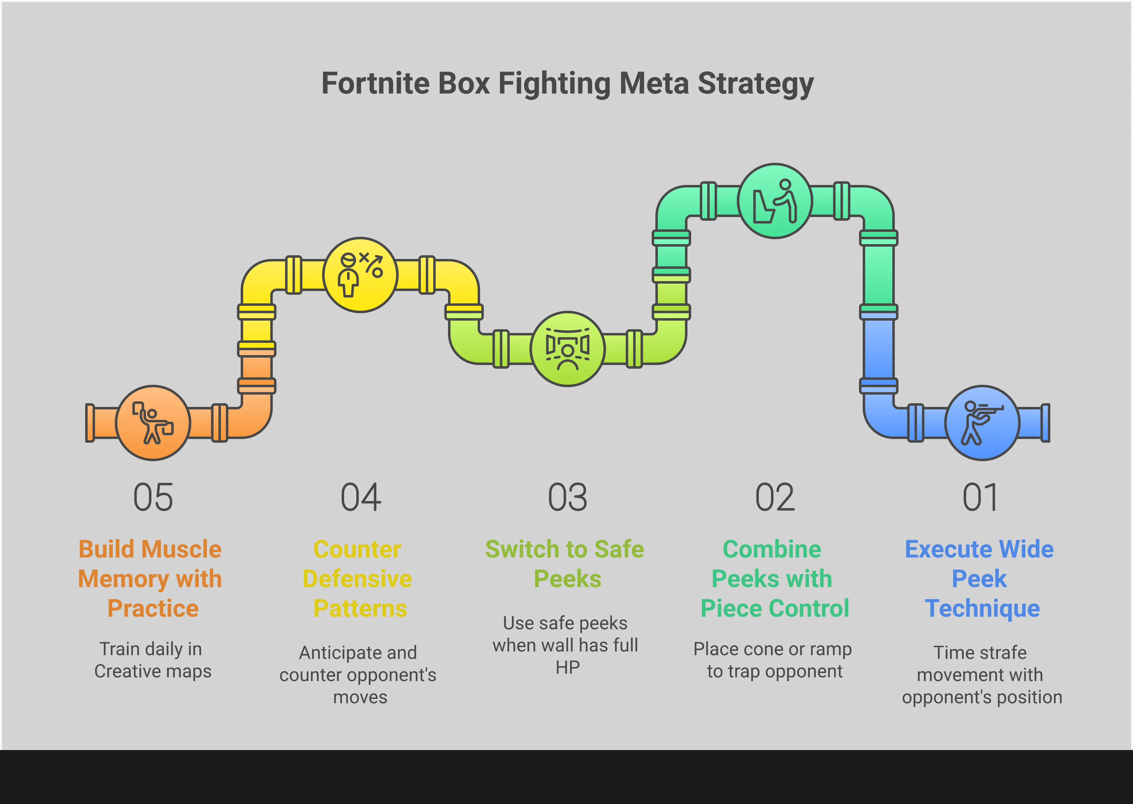 When battling in a box fight, dominating the building materials is key to winning. Quickly peeking around corners is much more effective than slowly revealing yourself, because it doesn’t give your opponent time to react, reinforce their structures, or prepare an attack. A fast, wide peek prevents them from building defenses or blocking your shots, limiting their options. If they try to quickly build upwards to protect a structure, a wide peek lets you destroy it before they can finish, keeping them on the defensive and allowing you to control the fight.