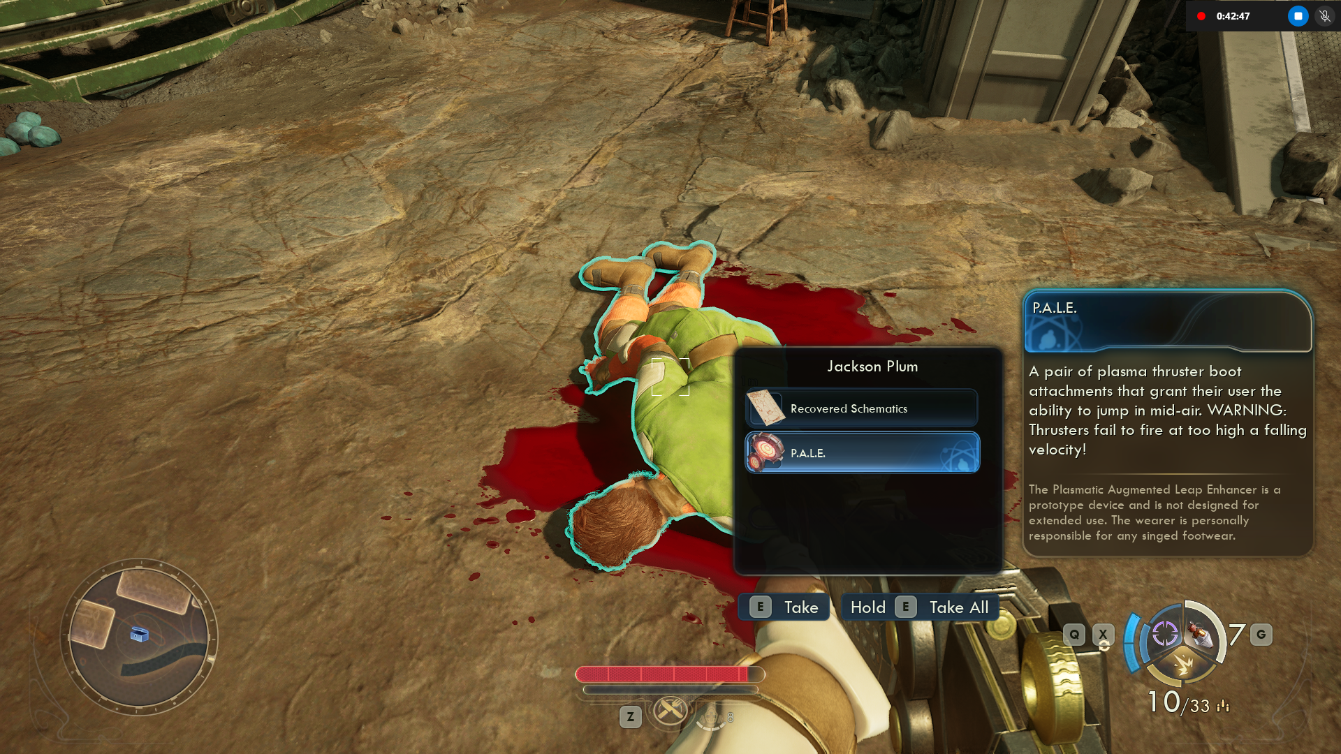 Search the body of the jumper – you’ll discover the schematic Huell needed, and a pair of P.A.L.E. boots that you should take for A Final Death For Gravity.