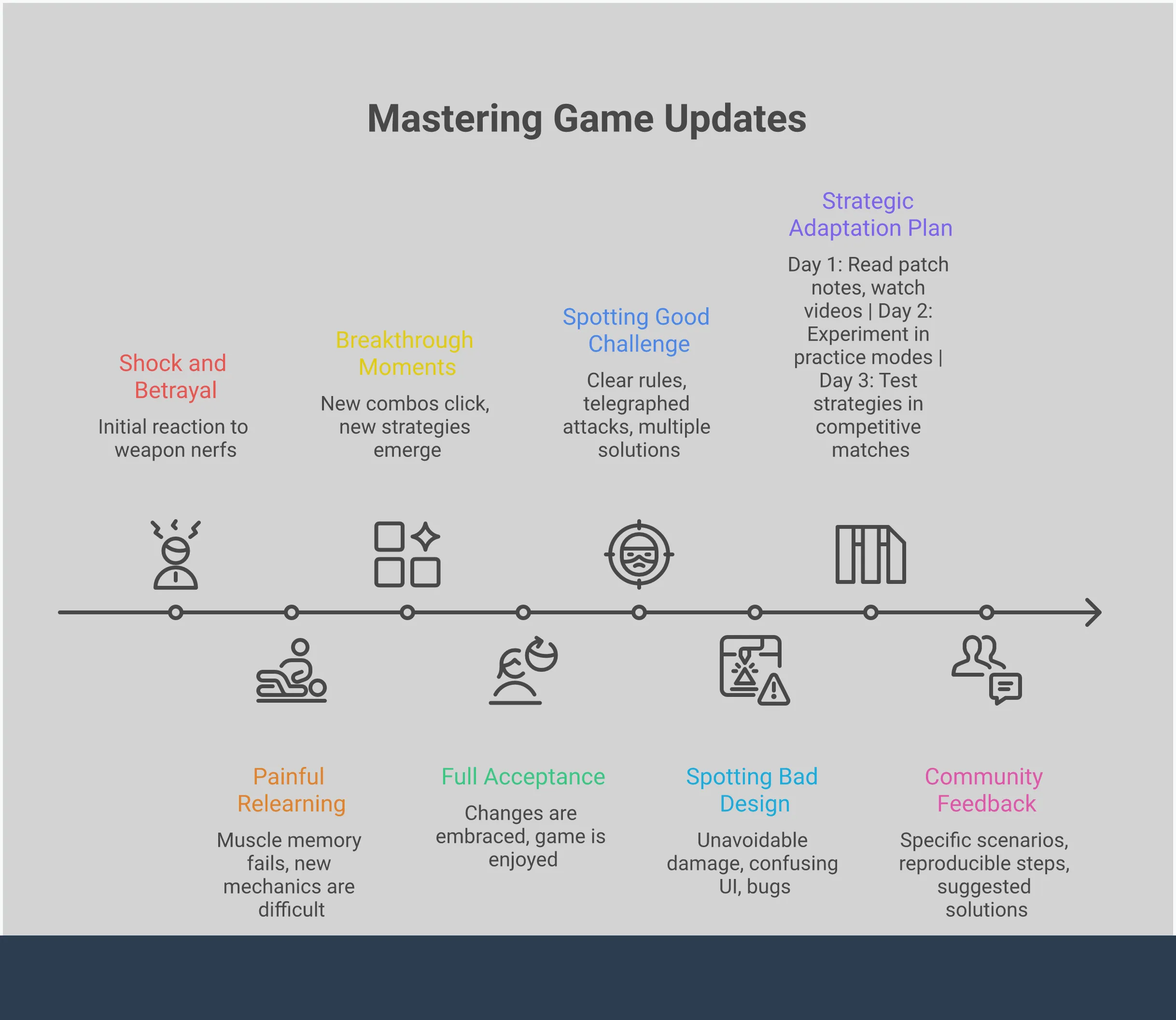 Instead of getting upset when game developers make changes, try seeing it as a chance to improve your skills. It’s not just about dealing with the changes, but about finding ways to succeed in the new version of the game. This means being patient with yourself, looking for the positive aspects, and remembering to take breaks. Try shifting your mindset from thinking, “They ruined my game,” to asking, “How can I master this new situation?” While it can be annoying, this is where you really grow as a player. You’ll learn to adapt quickly, try new tactics, and become a more well-rounded player. Let’s create a plan to help you handle these changes and maybe even rediscover your enjoyment of the game.