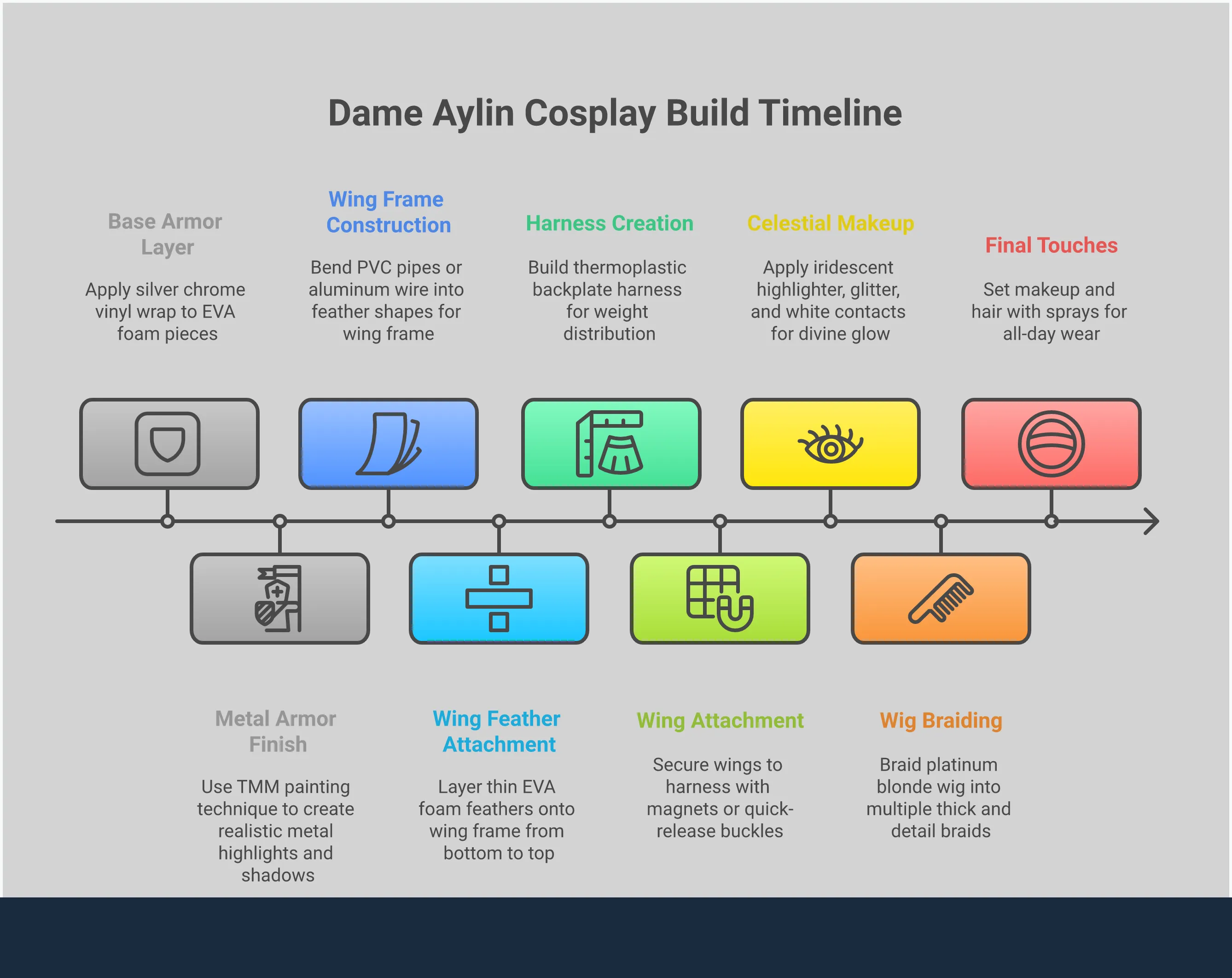 Dame Aylin’s wings are designed to be eye-catching, but also comfortable to wear. Cosplayers often aim for a light structure that looks strong without being too heavy for long events. A common technique is to build a frame using materials like PVC pipe or aluminum wire, then cover it with EVA foam to create the shape of the feathers. For a softer look, fabric or individual foam feathers can be layered on. The most important part is the harness: a strong backplate, usually hidden under the chest piece, distributes the weight and keeps the wings stable while you’re moving.