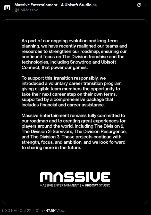Massive Entertainment, the studio behind games like The Division, Avatar: Frontiers of Pandora, and Star Wars: Outlaws (and a part of Ubisoft), has announced it is laying off some employees. The company described the layoffs as a “voluntary career transition program” in a statement on social media.