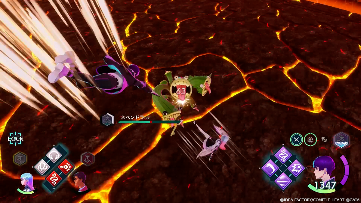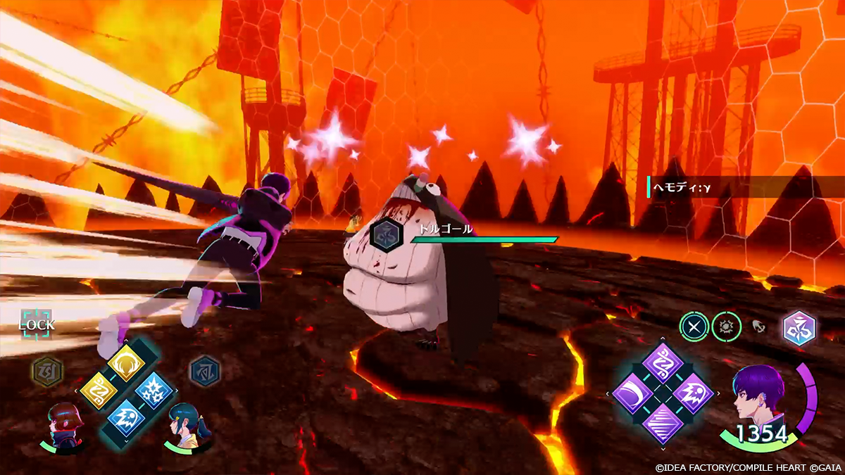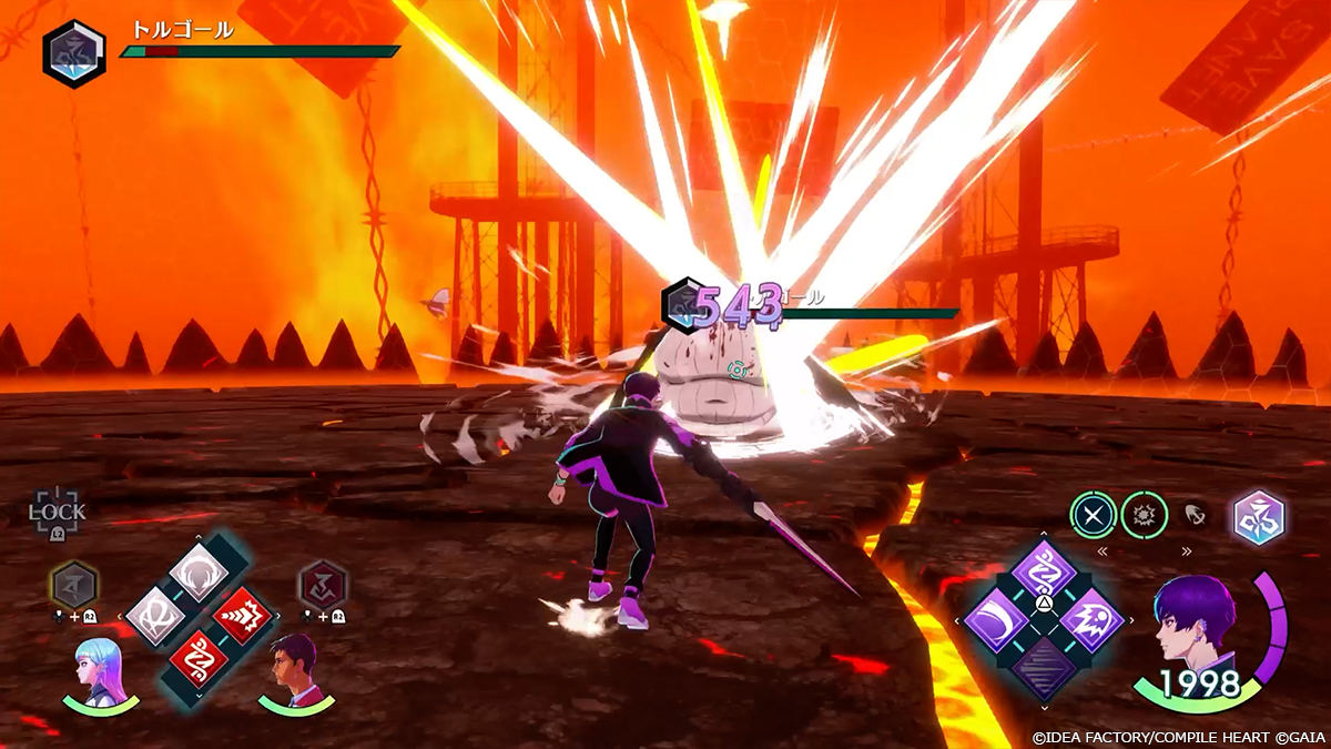When you encounter a monster in the dungeon, a fast-paced, real-time battle begins. Your party members can transform their arms into weapons using advanced genome technology – these are called Genome Arms. Battles happen in a ring-shaped arena, and anyone – friend or foe – can be instantly defeated if they’re knocked out of the ring.