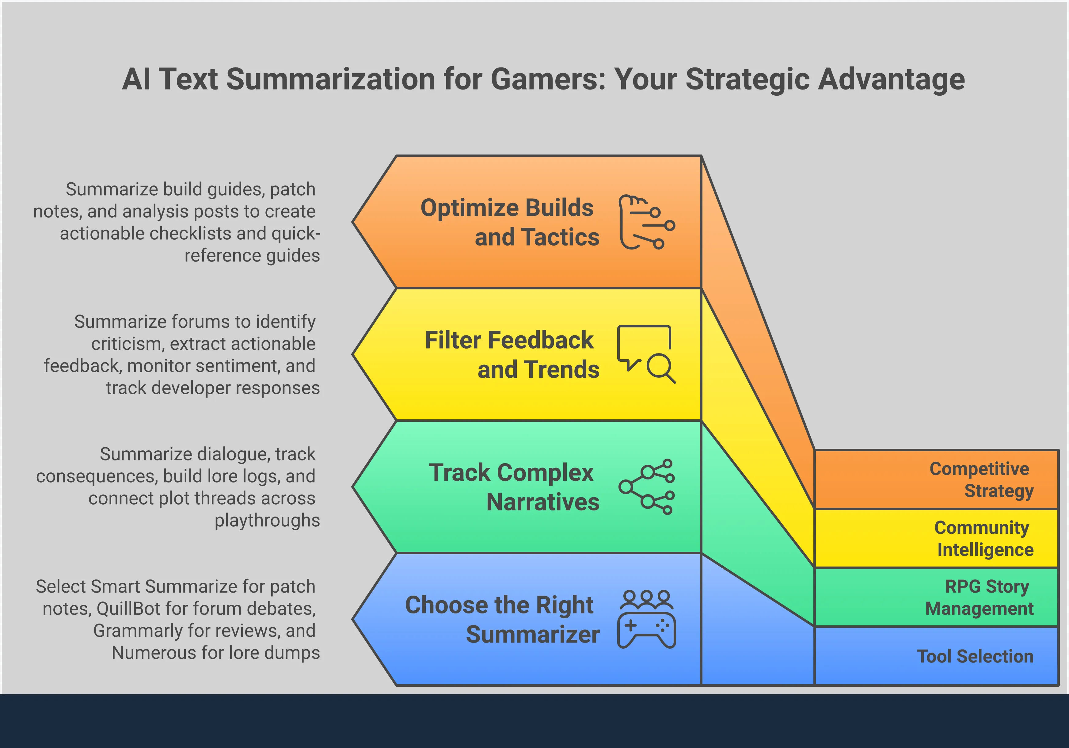Summarization tools help you quickly find the most important information, saving you time and effort. They’re like having a helper that reads everything about gaming for you and delivers the key points. You can stay updated on gaming news, understand the current best strategies without reading lengthy guides, and get a feel for what players are saying without dealing with negativity. Ultimately, these tools help you get the info you need fast, so you can spend more time actually playing games.