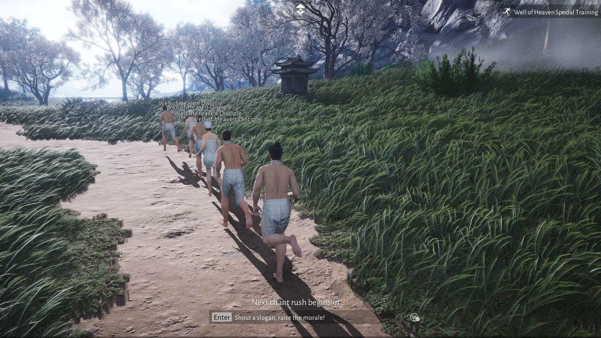 A simple and dependable way to start is by jogging daily in Qinghe. Find the Well of Heaven Disciples running on the path between Heaven’s Pier and Blissful Retreat. Talk to any of them to accept the challenge. You’ll need to run a certain number of laps and time your chanting perfectly.