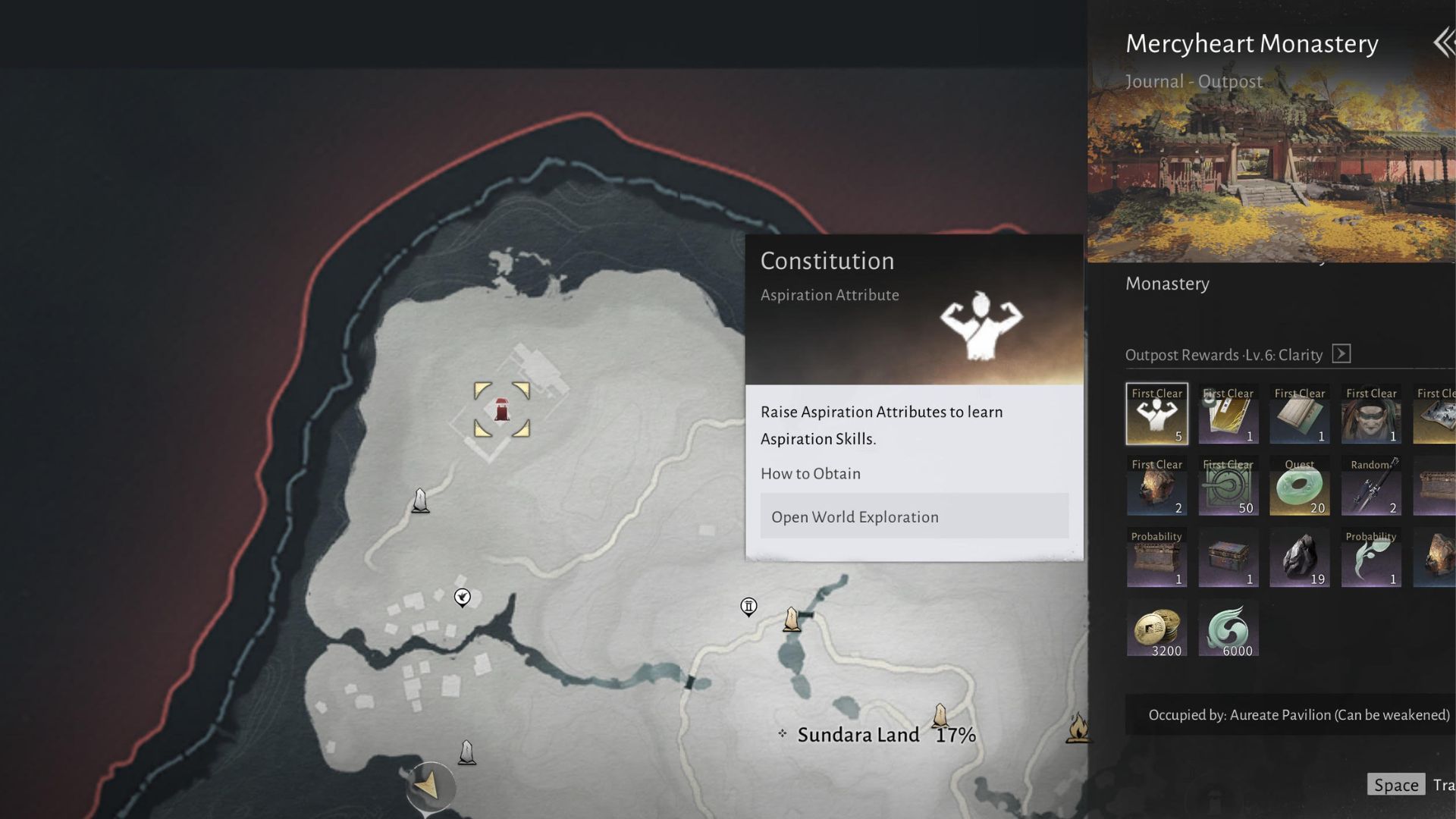 Red icons on the map show the locations of enemy forts, called Outposts. If you defeat all the enemies inside an Outpost, you’ll gain +5 Constitution the first time you do it.