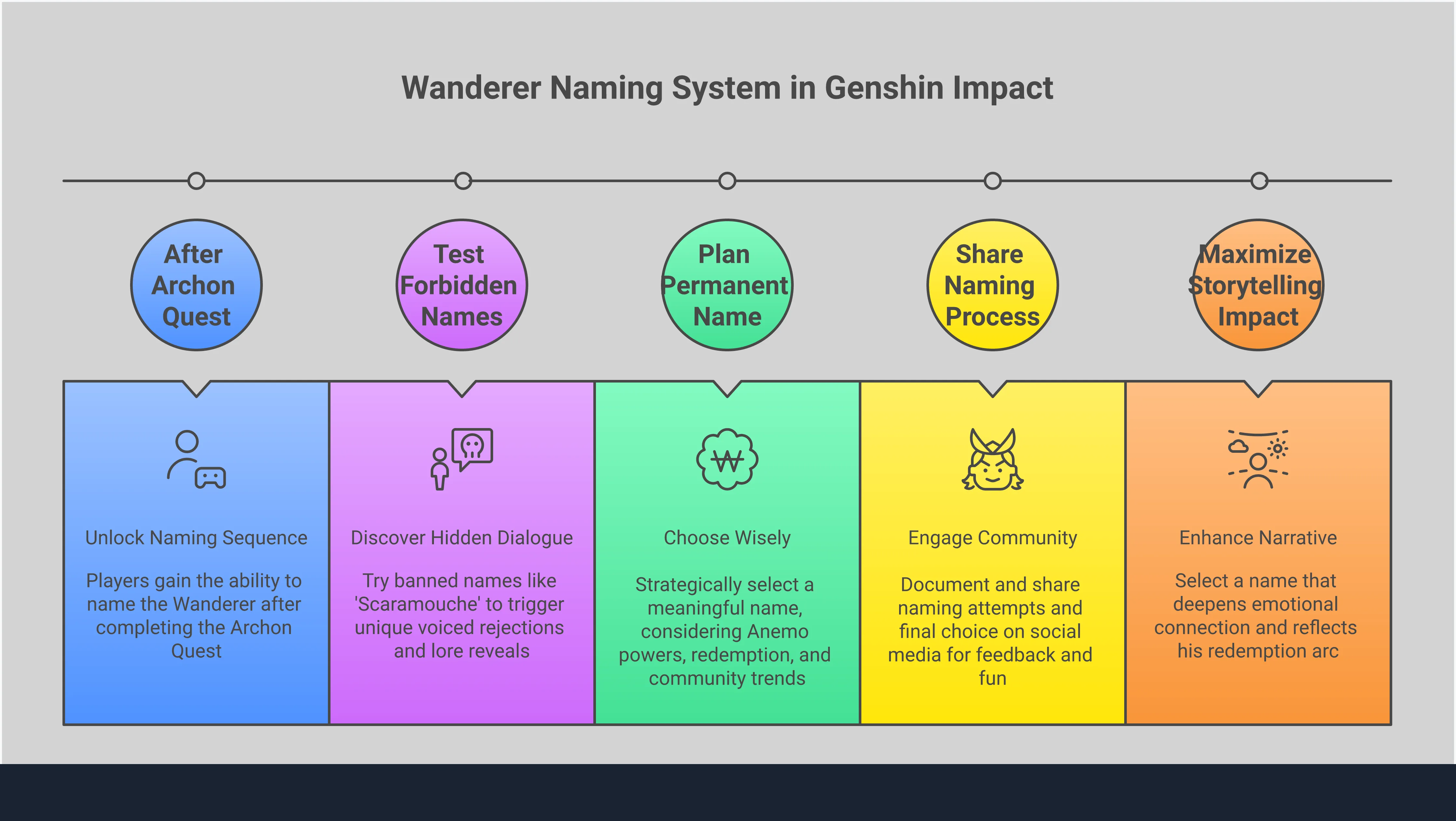 Okay, so this is kinda hilarious – everyone in the Genshin community is obsessed with naming the Wanderer! It’s not just about picking a name for my character, it’s become this whole thing where we share what we came up with online, and there are tons of funny compilations going around. A big part of the fun is seeing how the game reacts to certain names – seriously, everyone’s trying ‘Scaramouche’ just to see what happens! It’s weirdly awesome that something you do by yourself turns into this shared experience, and it’s really brought a lot of us players closer. It just shows how we all like to mess around and create our own little inside jokes within the game, which is pretty cool.