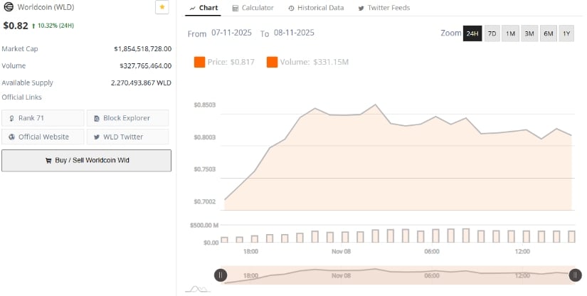 Hold on to your hats, because here comes the juicy data: Worldcoin is trading at $0.82, which is a whole 10.32% higher than 24 hours ago. 🎉 The project’s market cap is hovering around $1.85 billion, which is cute, and the 24-hour trading volume is a solid $327.7 million. For those keeping score, Worldcoin is holding a market rank of 71, which is a nice little mid-cap spot to cozy up in. Gotta love that. 📈