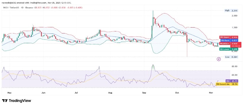 Let’s talk technicals, because why not? On TradingView, Worldcoin’s daily chart shows some improvement, though the price is still flirting with the middle line of the Bollinger Bands at $0.837. The upper band is teasing us at $0.976, while the lower band is chilling at $0.698-because who doesn’t love a good range of uncertainty? 😂