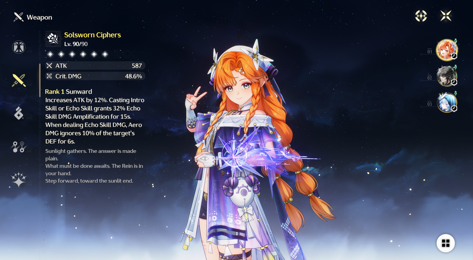 Sigrika’s weapon is a great match for how she plays. It boosts her critical damage and attack power, and it makes her Echo Skill even stronger after she uses either an Intro Skill or her Echo Skill. Plus, it lets her Aero damage bypass some of the enemy’s defense, significantly increasing her overall damage output.