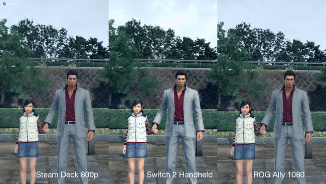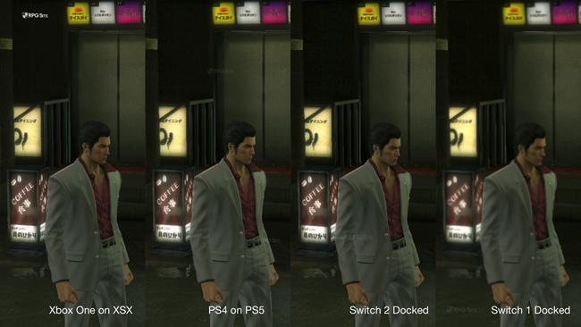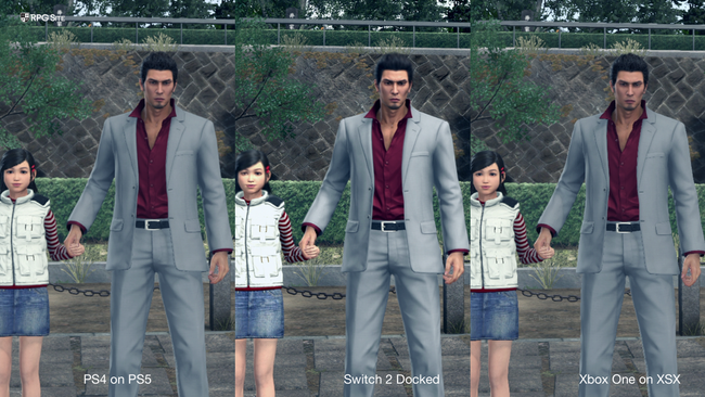 I think Yakuza Kiwami 2 looks better on the Switch 2, even in handheld mode, than it does on the PS4, Xbox One, or even the PS5 and Xbox Series X (when playing the older versions). The PS4/Xbox One/PS5/Series X versions have a lot of noticeable shimmering and jagged edges, while the Switch 2 version appears smoother and has more detailed environments.