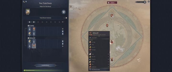 Trade routes are managed in a dedicated tab on the left side of the screen. Think of them as automated delivery systems: you select a ship and the islands it will travel between, and it will continuously transport the resources you specify. Ships with more cargo space can carry more goods. Trade routes are especially useful for balancing production – if one island is missing a resource, you can simply import it from another island that has it. For instance, if an island lacks metal, you can have it delivered from an island with metal deposits.