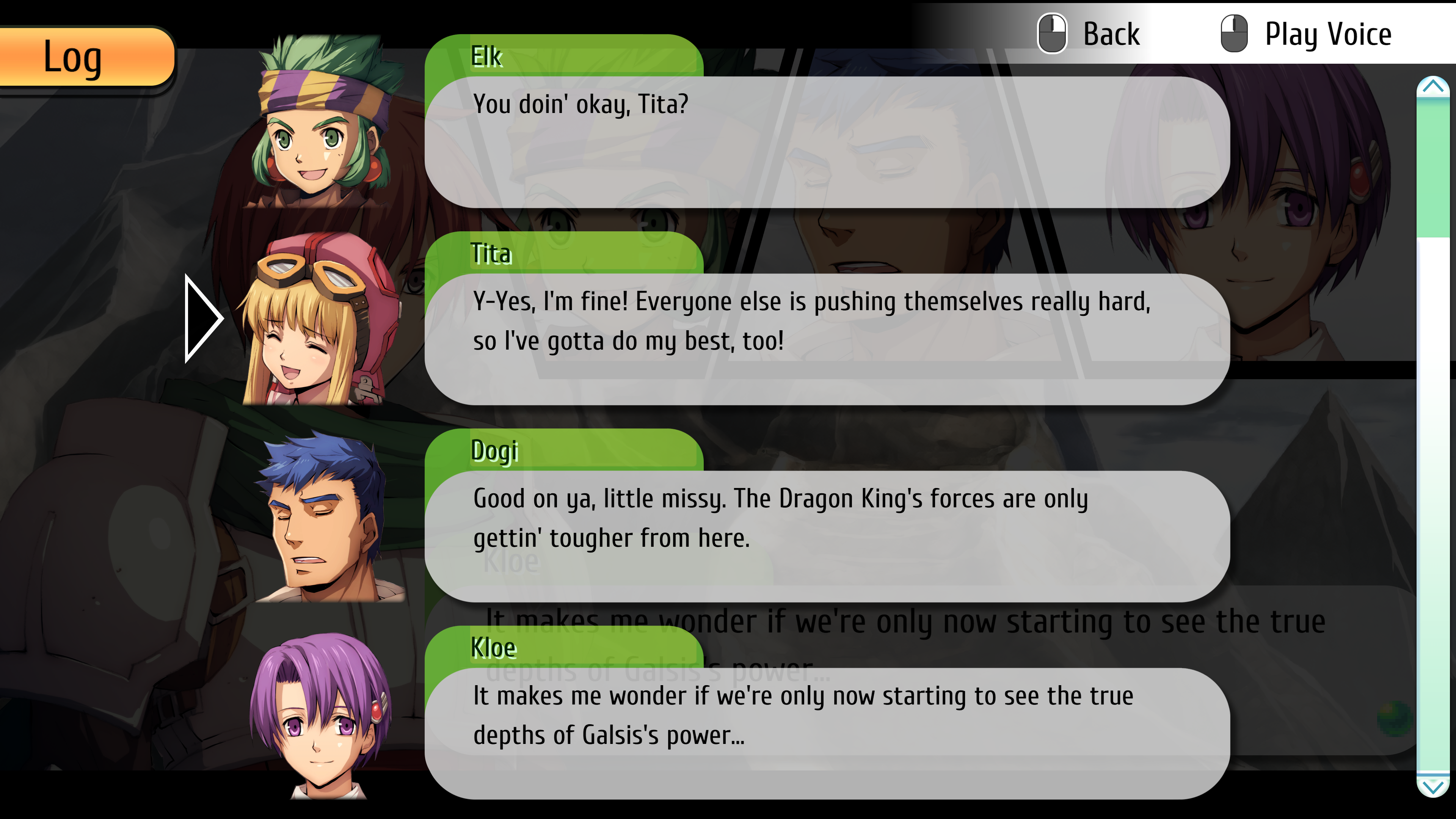If you need a refresher on the story, you can quickly catch up during cutscenes. By pressing the “Up” button (usually W on keyboard or the D-Pad Up on a controller), you’ll open a message log. This log lets you review the entire story from the beginning, and even replay each voice line. This feature is common in recent games from Falcom and fits seamlessly into the experience.